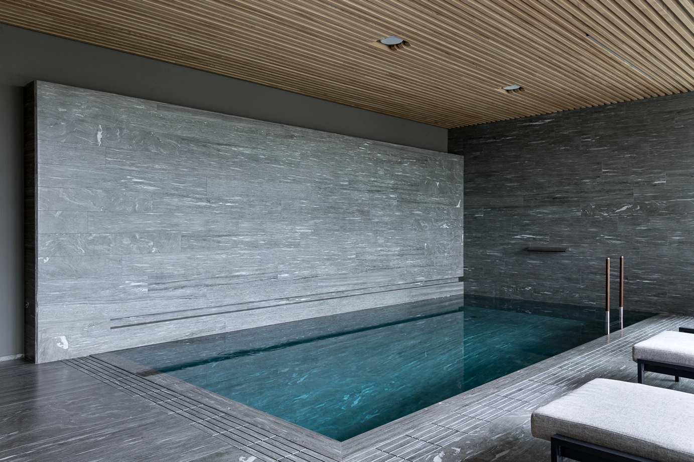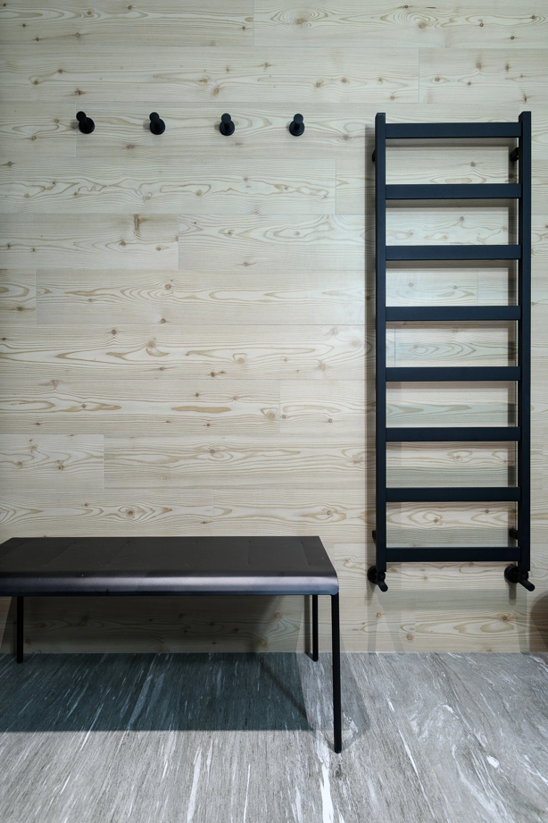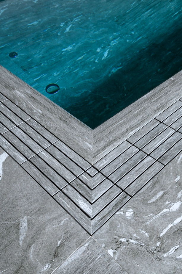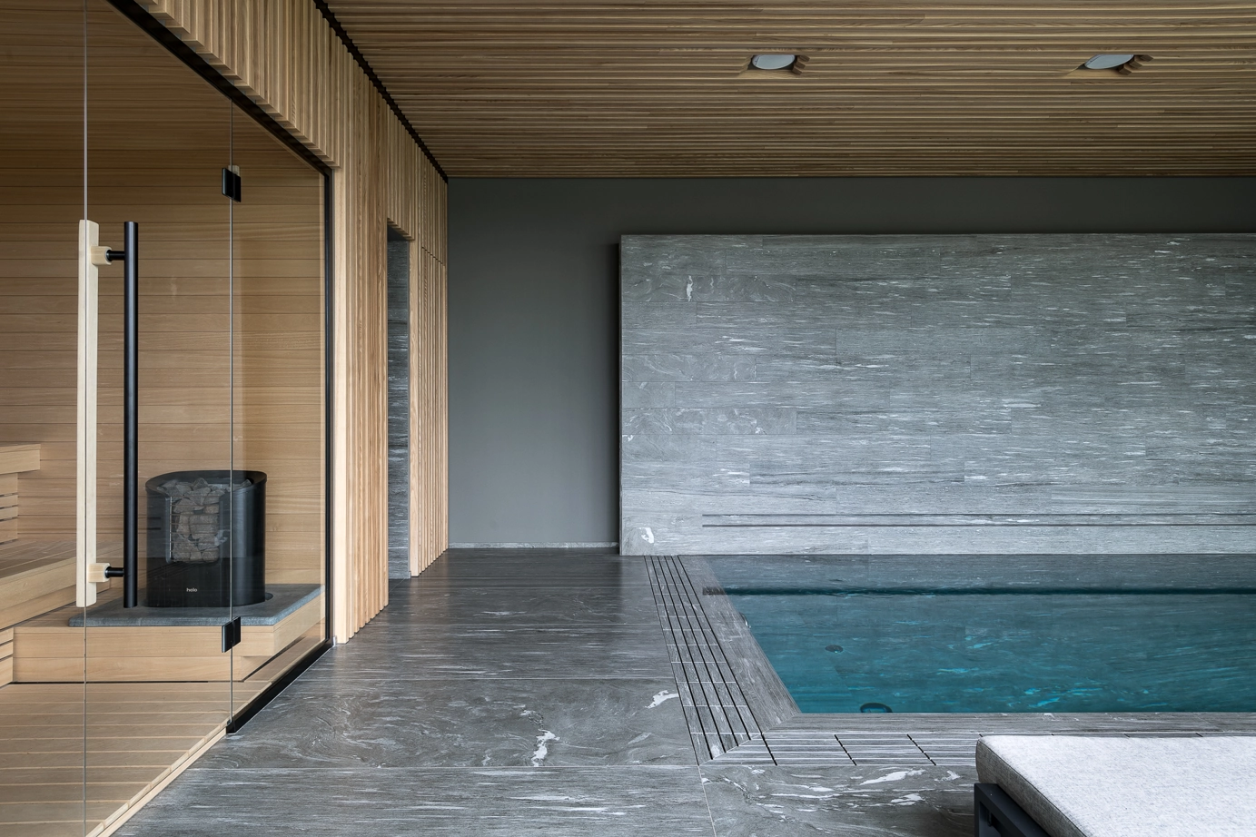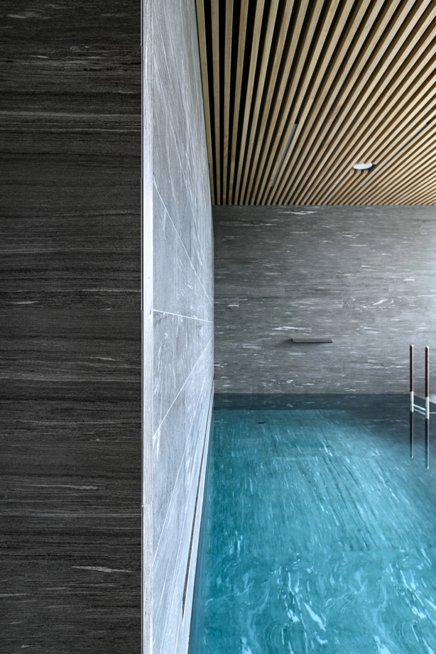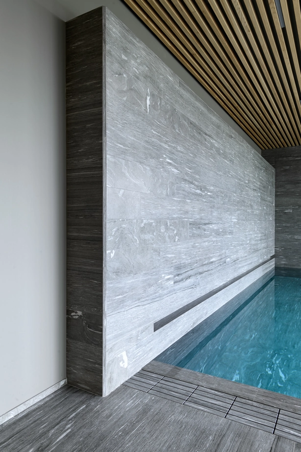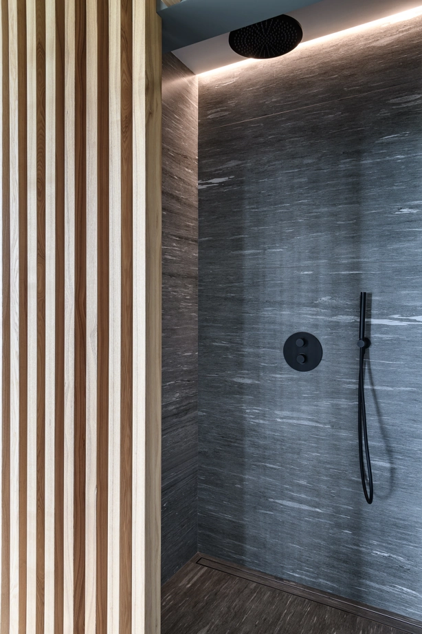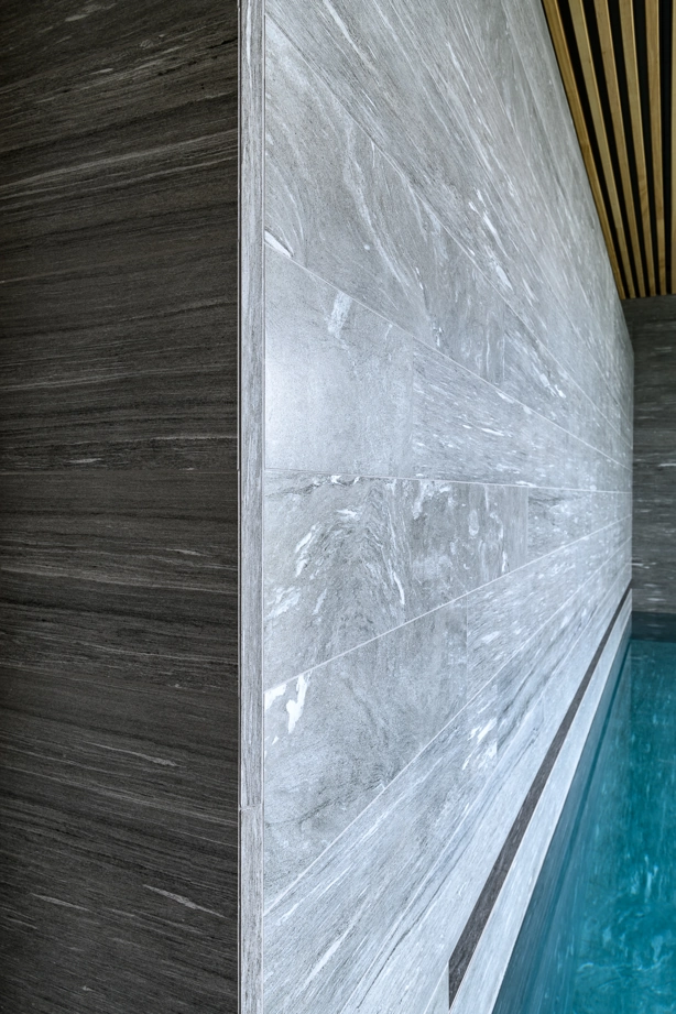 La pietra grigia alpina Skyfall Grigio Alpino è famosa per la sua grafica straordinaria, che può variare notevolmente da lastra a lastra. Il formato 80x160 cm con finitura naturale si è rivelato la soluzione ideale per il pavimento, garantendo eleganza e praticità. Per il rivestimento delle pareti è stato scelto il formato 20x160 cm, che ha permesso di esaltare ulteriormente la texture sorprendente della pietra, aggiungendo profondità e dinamismo all'interno.