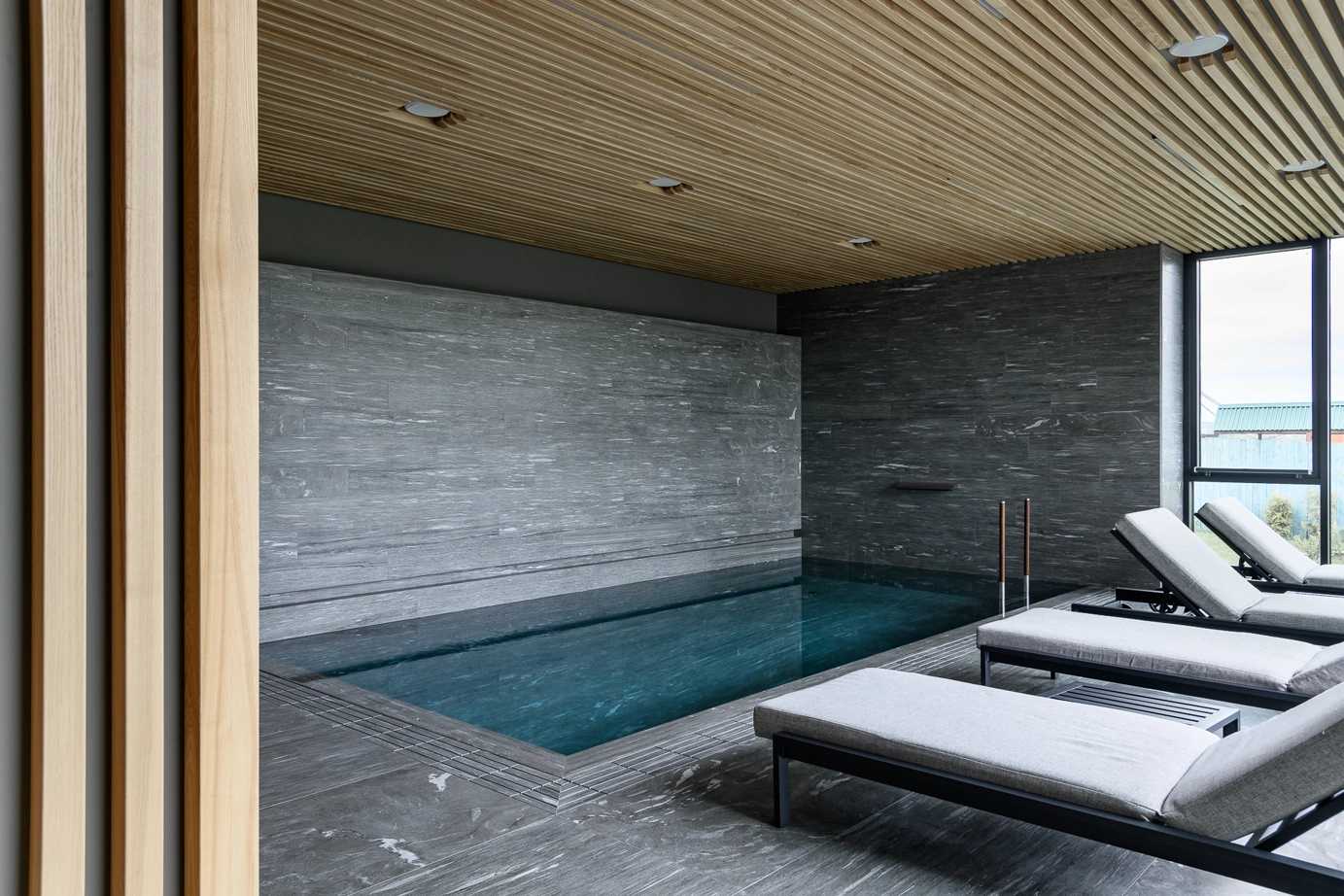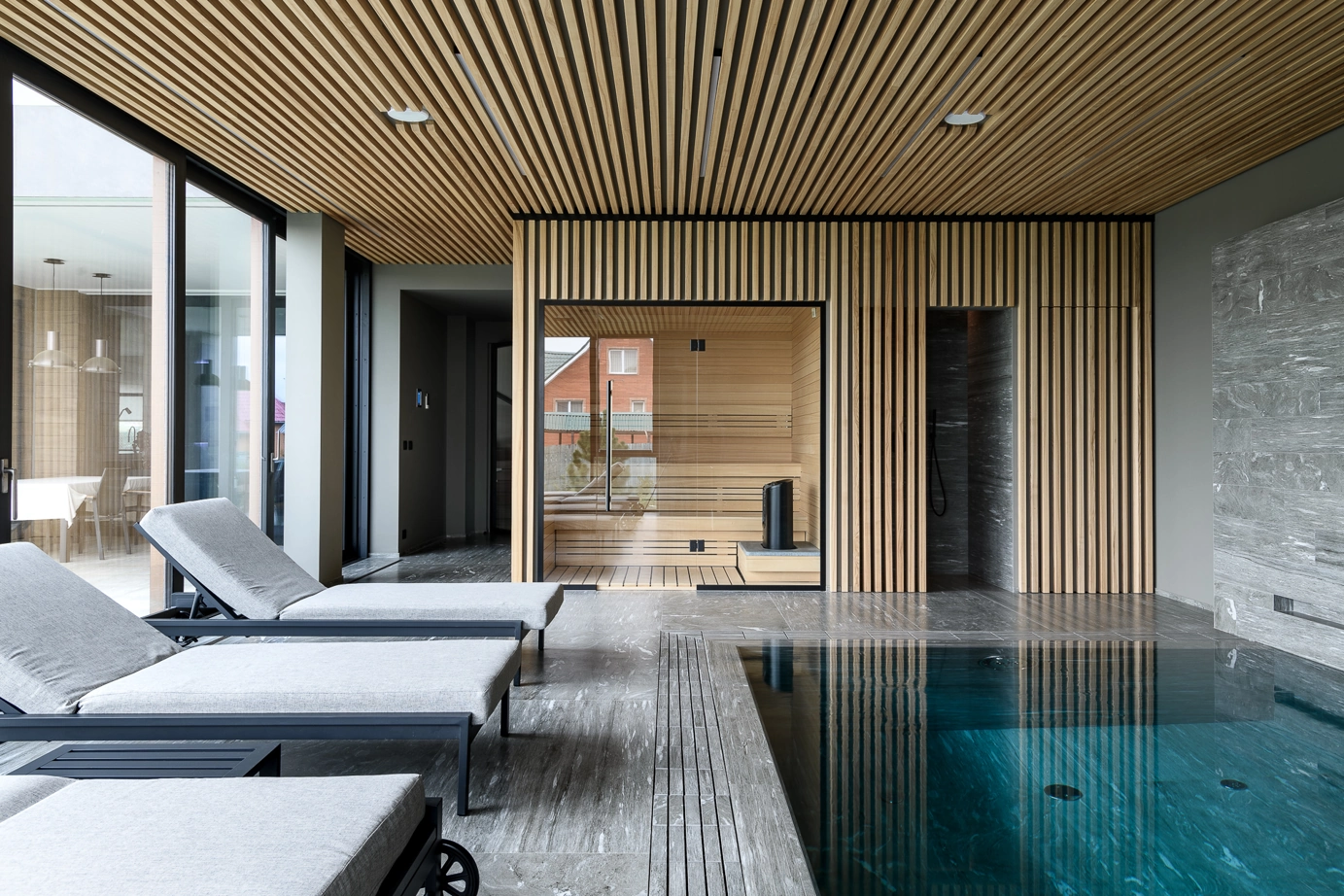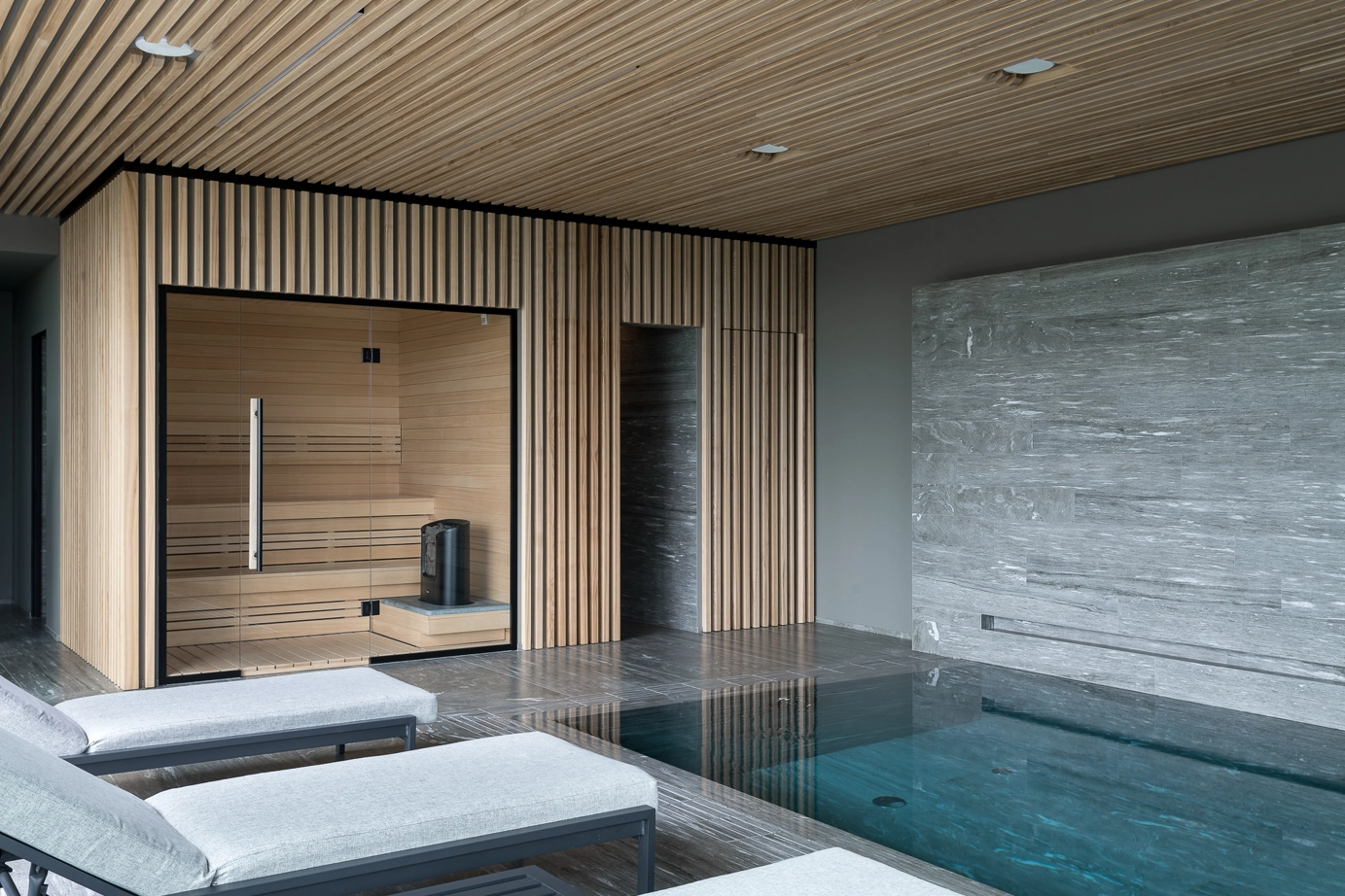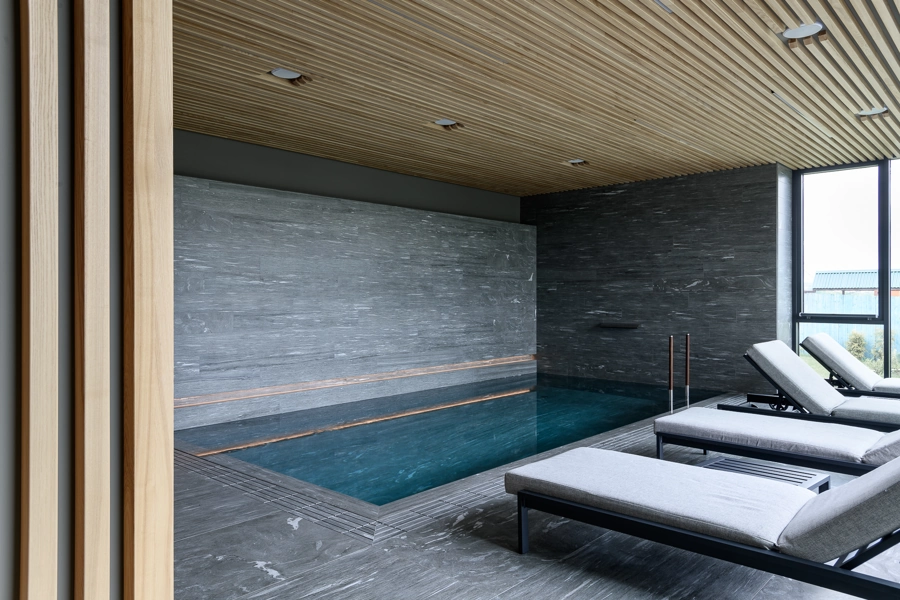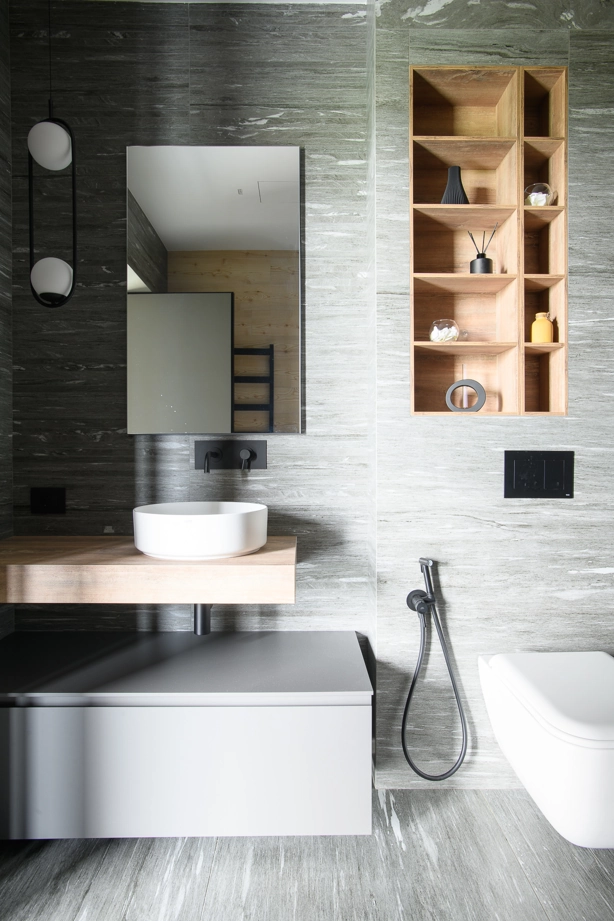 La pietra grigia alpina Skyfall Grigio Alpino è famosa per la sua grafica straordinaria, che può variare notevolmente da lastra a lastra. Il formato 80x160 cm con finitura naturale si è rivelato la soluzione ideale per il pavimento, garantendo eleganza e praticità. Per il rivestimento delle pareti è stato scelto il formato 20x160 cm, che ha permesso di esaltare ulteriormente la texture sorprendente della pietra, aggiungendo profondità e dinamismo all'interno.