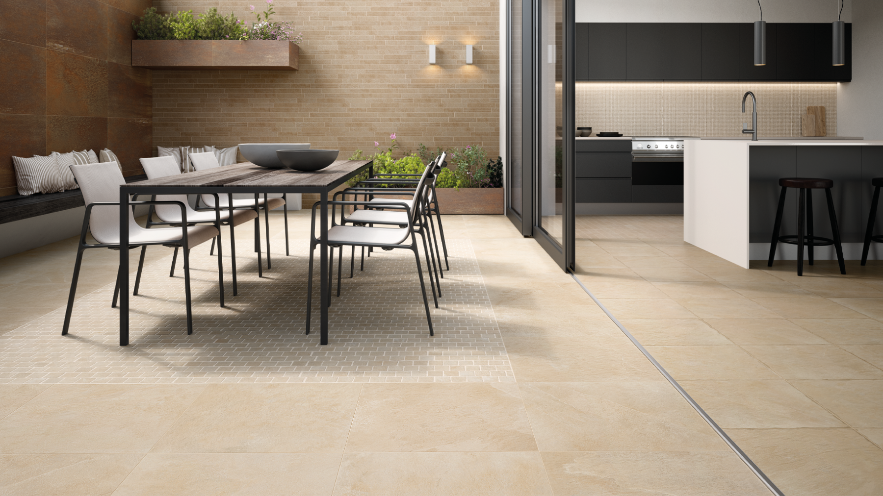 Дизайн летней кухни повторяет цветовую гамму кухни внутри дома. В пространстве под открытым небом сдали ставку на фактуру материла. На полу уложен уличный керамогранит в бежевом цвете Магнезио X2 60x60 с противоскользящей поверхностью, обеденная зона выделена оригинальным декором Магнезио X2 Блокс 26,3x33. Одна из стен оформлена декором Брик Мультилайн Ворм 29,6x79,6 со структурированными элементами, остальные облицованы керамогранитом с эффектом ржавого металла Cерфейс Кортен 60x120.