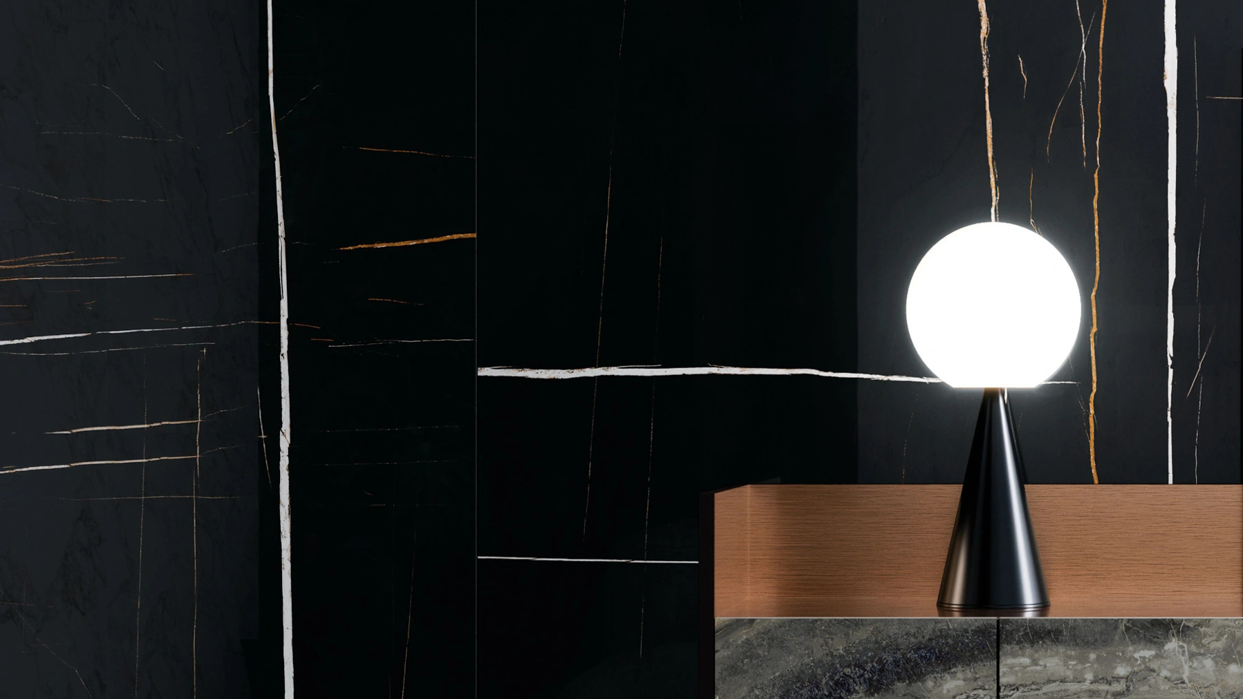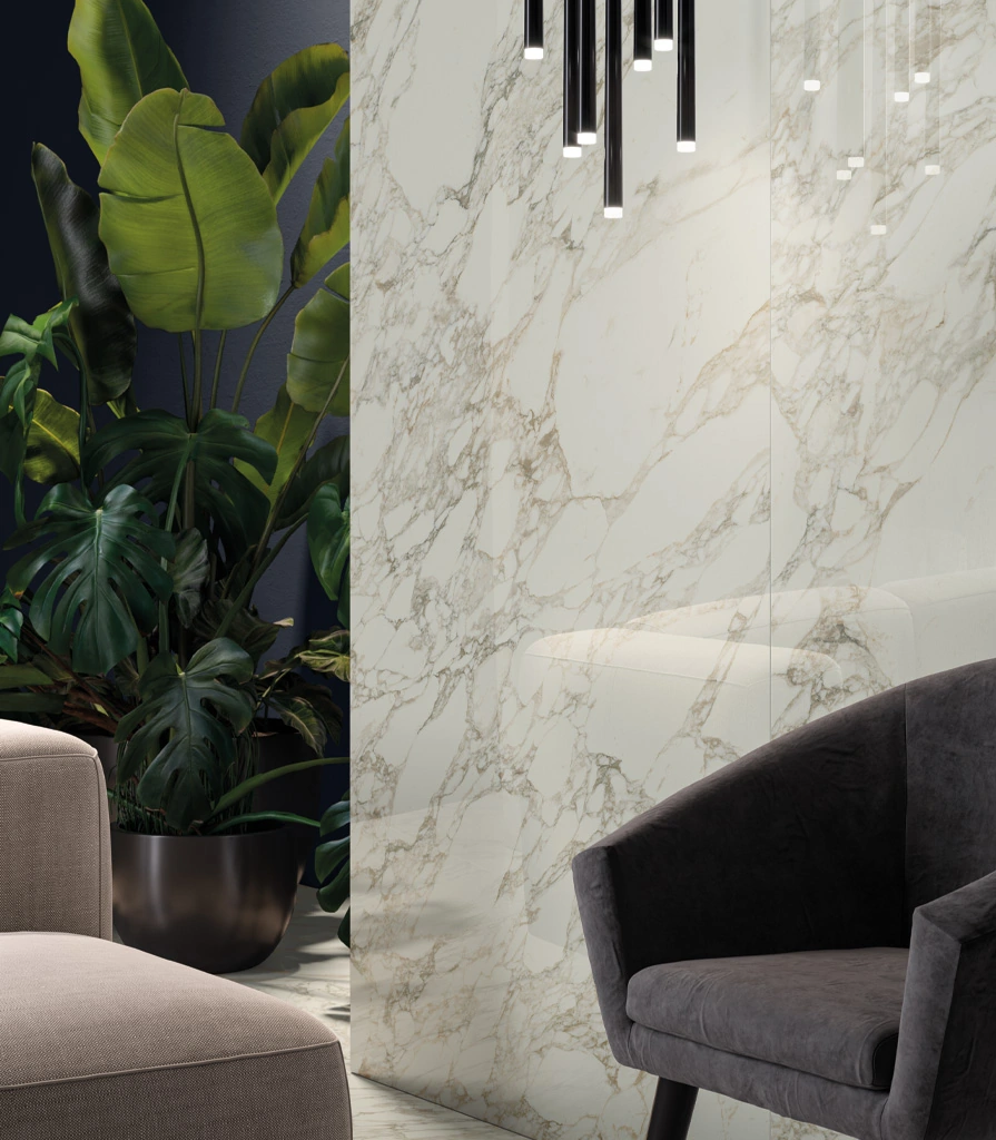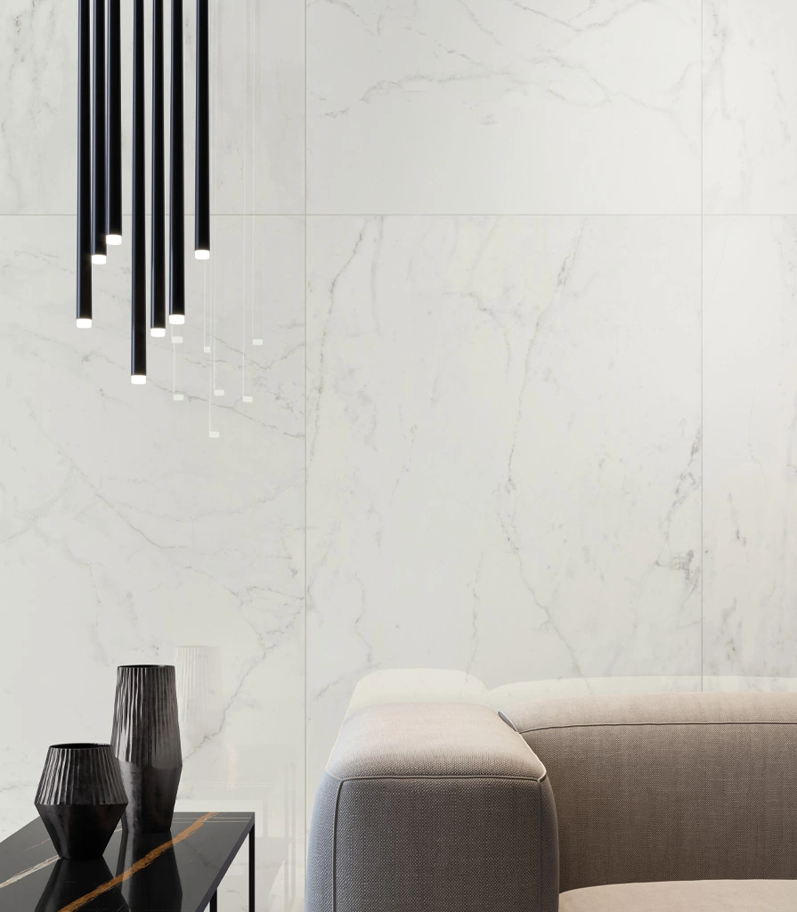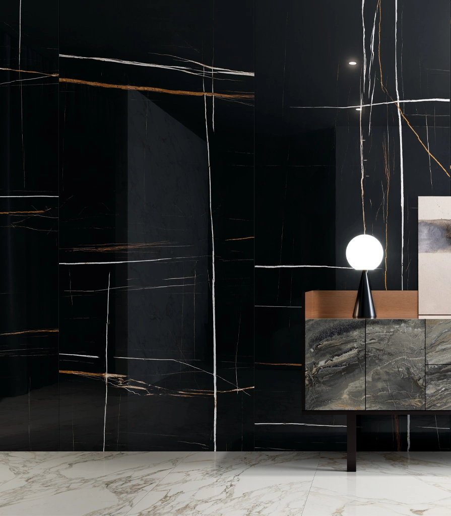 Интерьер пентхауса построен на эклектичных композициях, рожденных из необычного контраста черного и белого цвета. Светлый керамогранит под мрамор Арабескато Уайт и Бьянко Микеланджело и темный Сахара Нуар прекрасно подходят для дизайна гостиной. Три совершенно разных мрамора безупречно сочетаются между собой и придают интерьеру яркий, современный облик. Крупноформатная плитка 120х278 Сахара Нуар на стене в глянцевой поверхности люкс притягивает взгляд и создает ощущение безграничной роскоши.