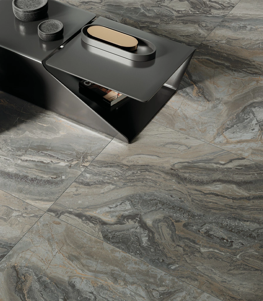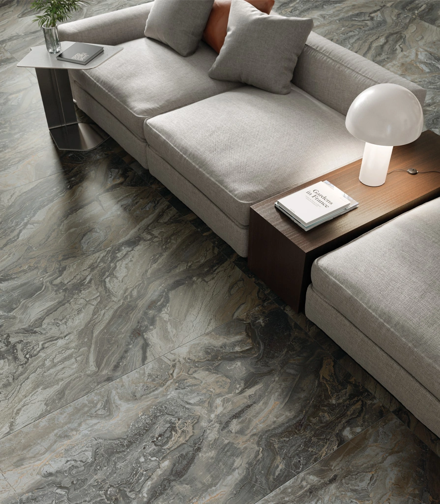 Выразительная графика серого керамогранита Гриджио Оробико подчеркивает оригинальный дизайн гостиной. Он акцентирует внимание на безграничной роскоши в каждой детали. Гармоничное сочетание мягких серых оттенков и прожилок мрамора и высокие технические характеристики делают этот крупноформатный керамогранит 80х160 идеальным решением для создания эффектного интерьера гостиной.