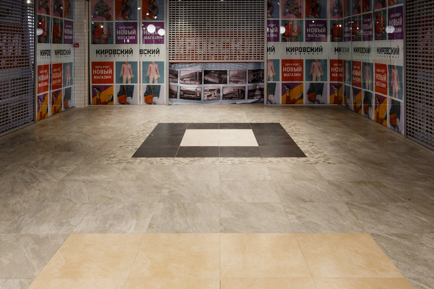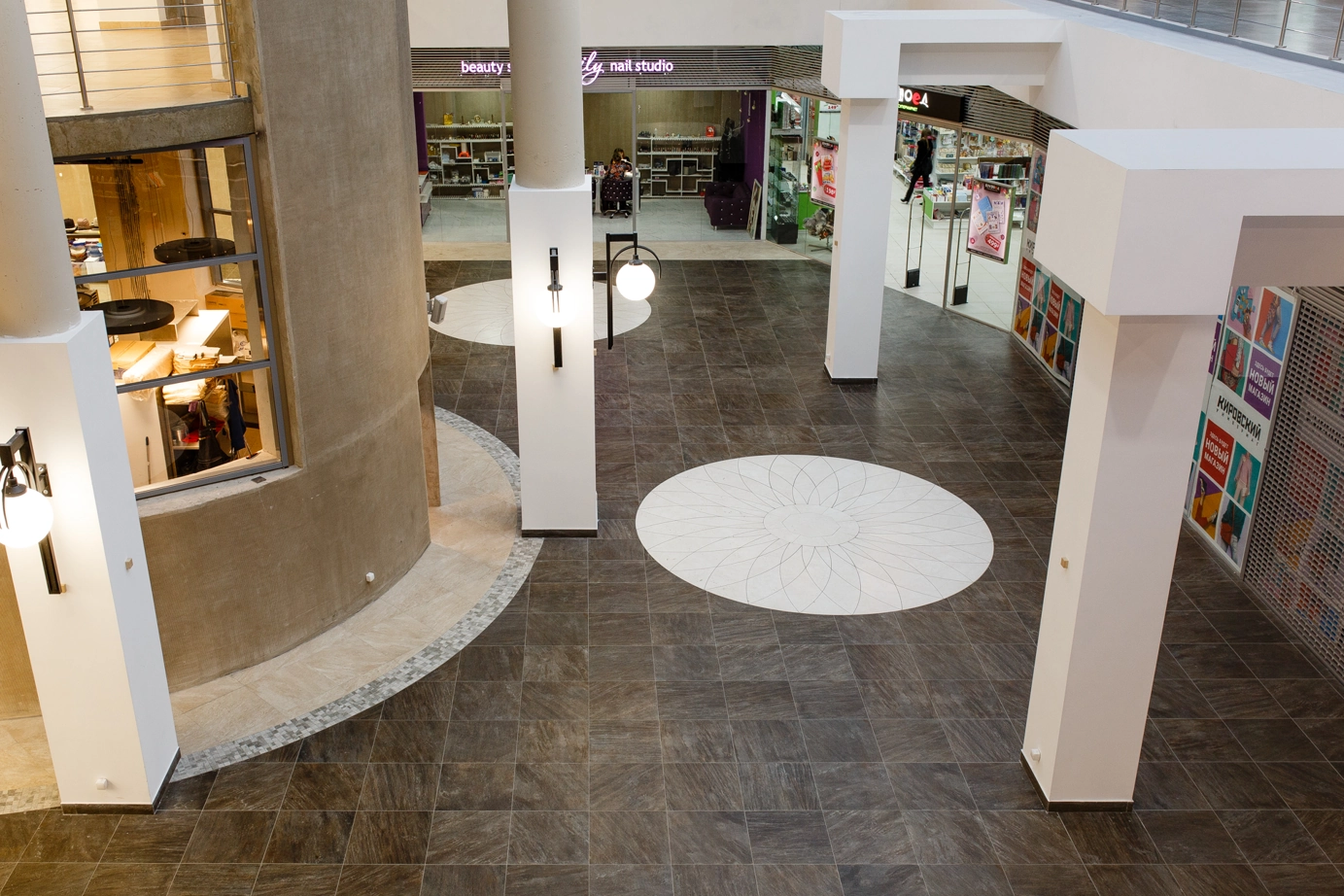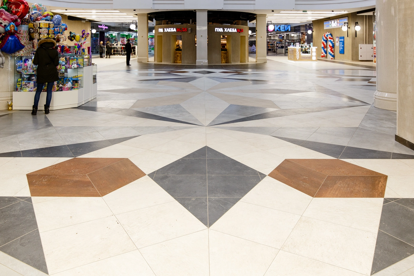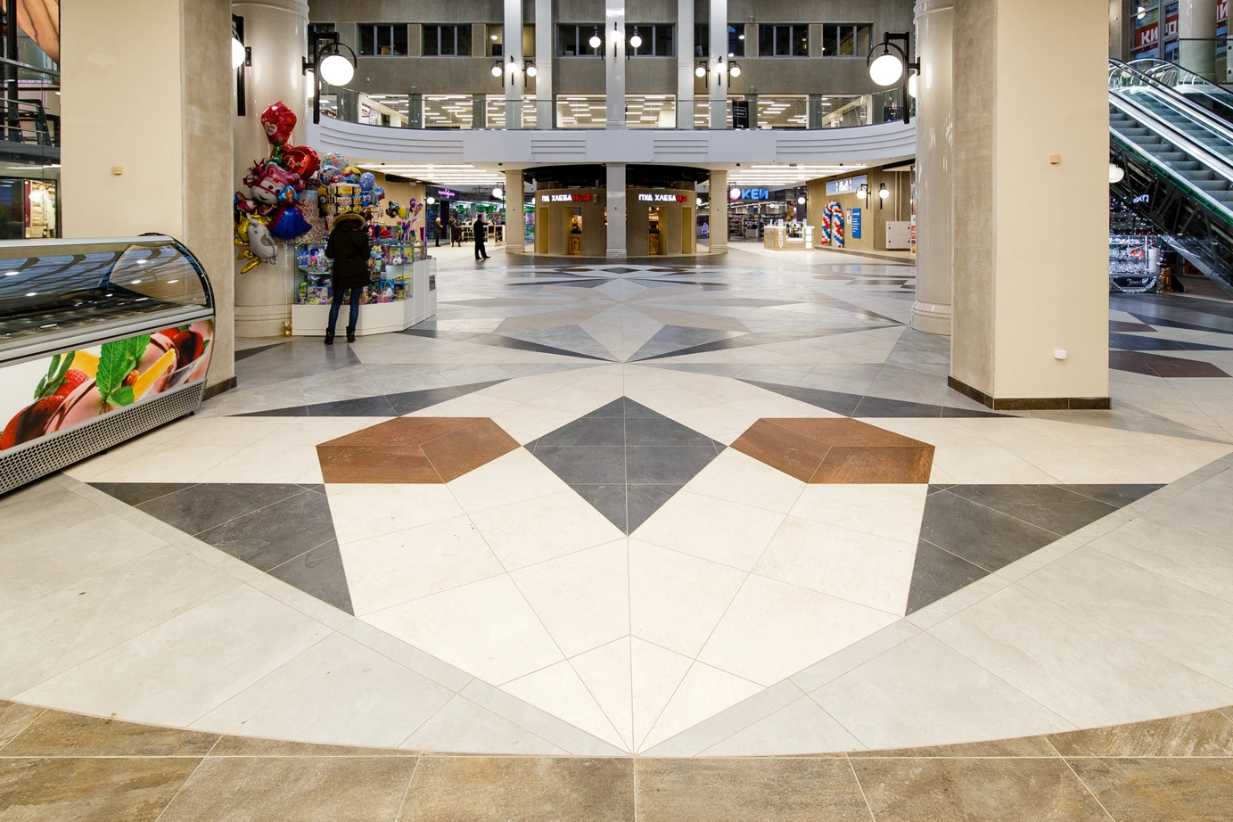 За основу были взяты природные текстуры в современной интерпретации, воплощенные в коллекциях керамогранита Italon. Каждый этаж универмага имеет уникальный дизайн. Галерею на 1 этаже украшают изысканные резные панно, выполненные из керамогранита  Climb, Materia, Surface и Contempora  в разных типах поверхности. Особенностью отделки  второго этажа стала мультиформатная укладка патинированного сланца  Materia Carbonio 60x120, 60х60 и 30х60.