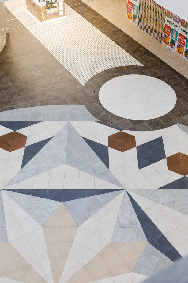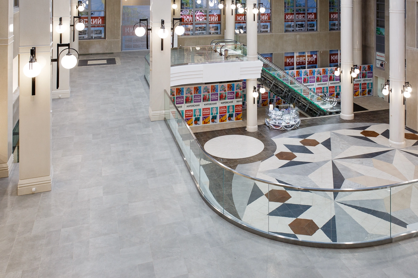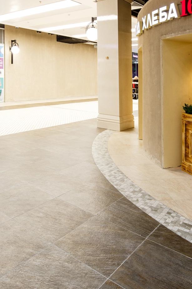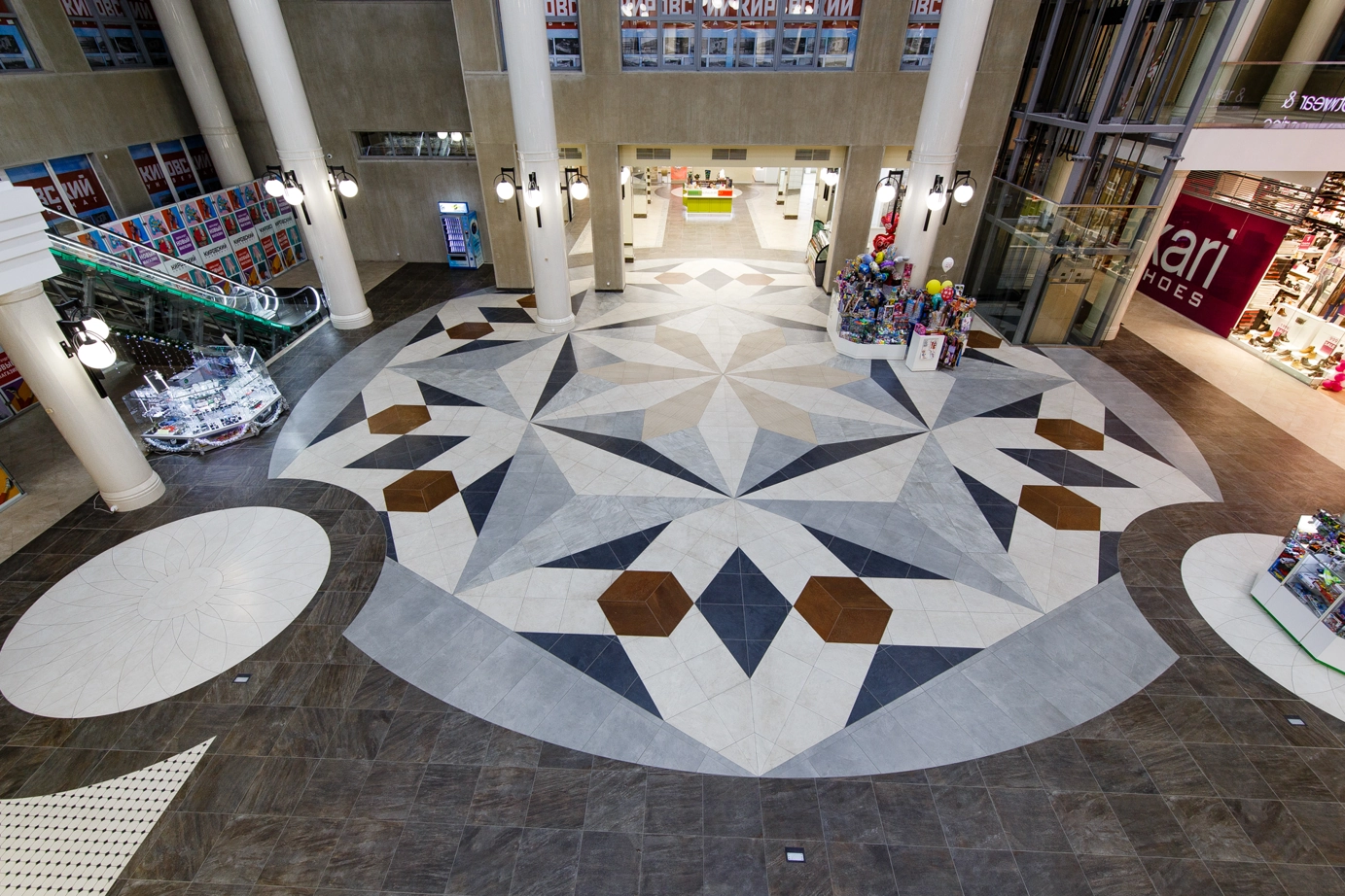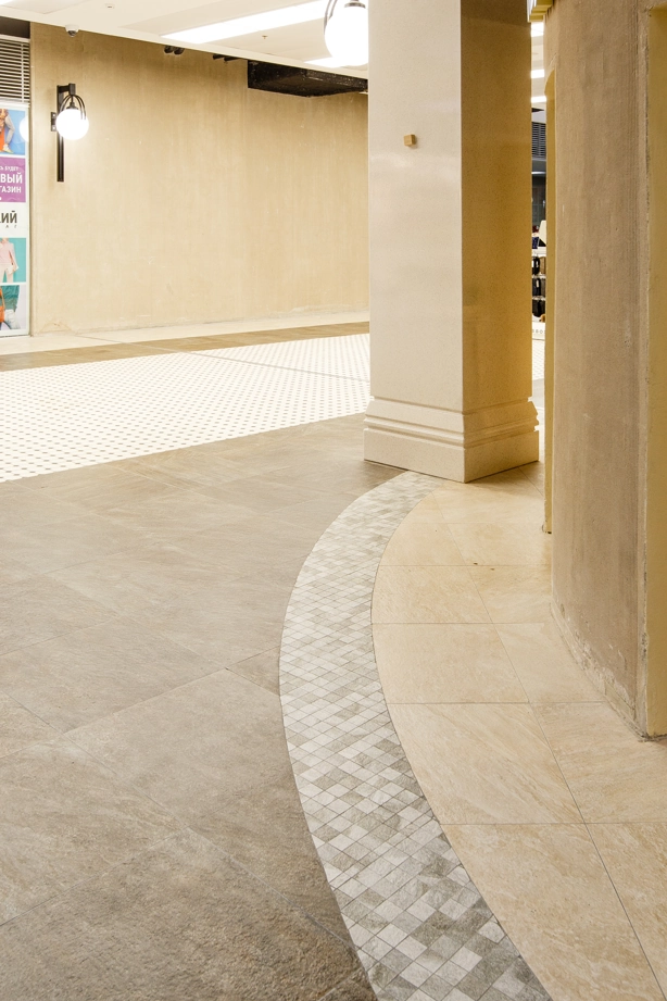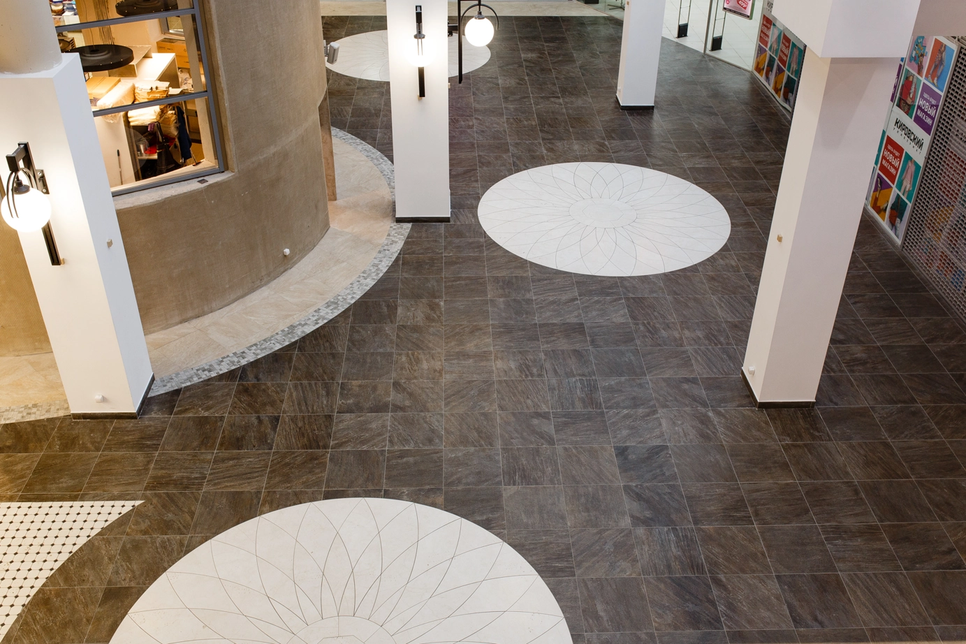 За основу были взяты природные текстуры в современной интерпретации, воплощенные в коллекциях керамогранита Italon. Каждый этаж универмага имеет уникальный дизайн. Галерею на 1 этаже украшают изысканные резные панно, выполненные из керамогранита  Climb, Materia, Surface и Contempora  в разных типах поверхности. Особенностью отделки  второго этажа стала мультиформатная укладка патинированного сланца  Materia Carbonio 60x120, 60х60 и 30х60.