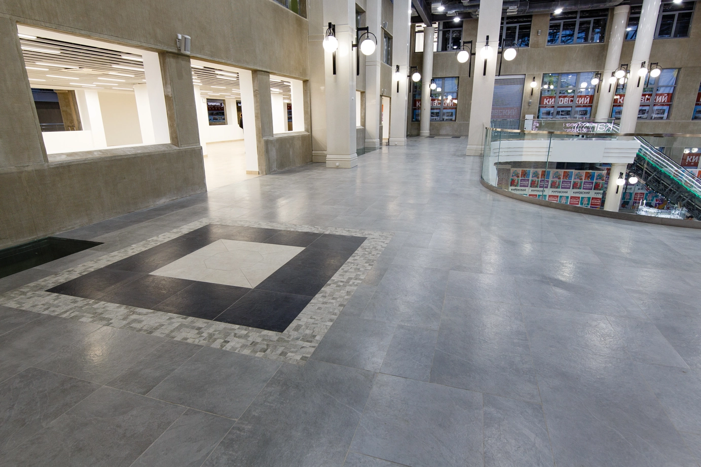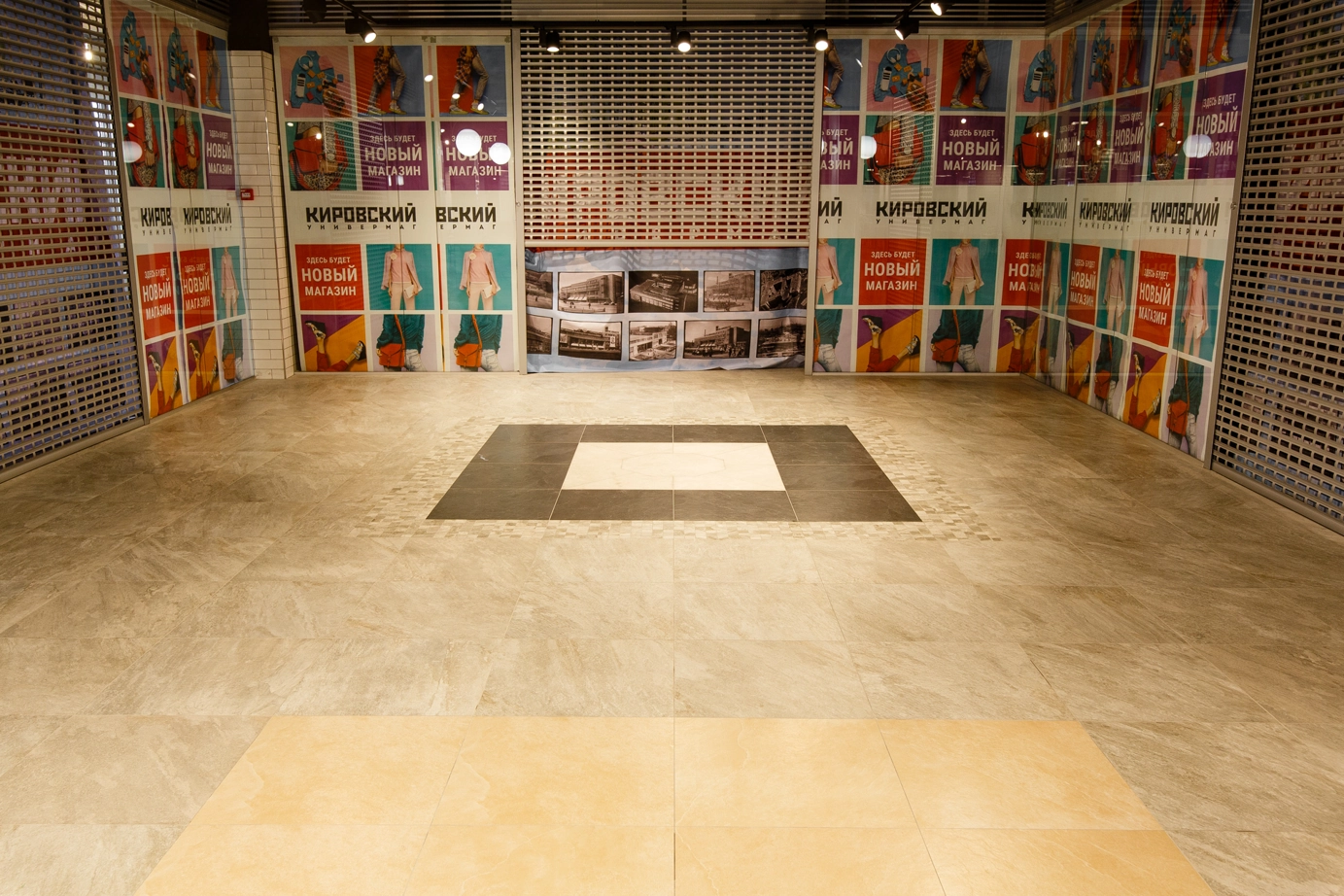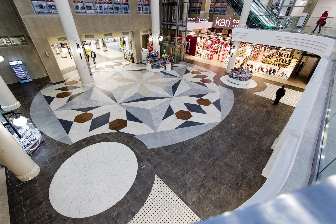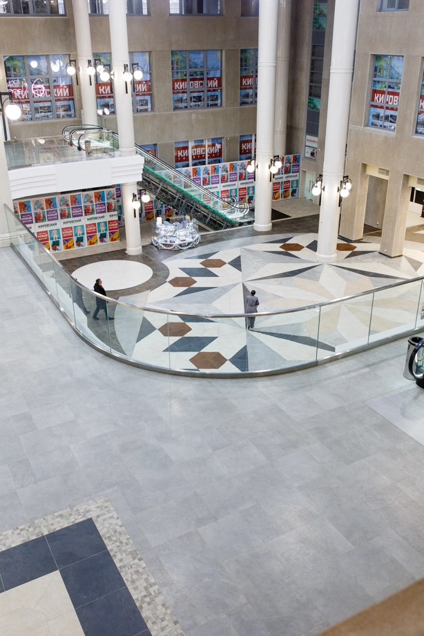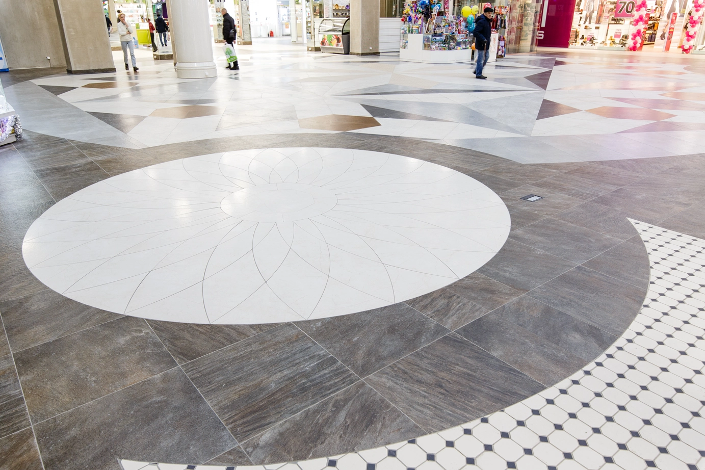 За основу были взяты природные текстуры в современной интерпретации, воплощенные в коллекциях керамогранита Italon. Каждый этаж универмага имеет уникальный дизайн. Галерею на 1 этаже украшают изысканные резные панно, выполненные из керамогранита  Climb, Materia, Surface и Contempora  в разных типах поверхности. Особенностью отделки  второго этажа стала мультиформатная укладка патинированного сланца  Materia Carbonio 60x120, 60х60 и 30х60.