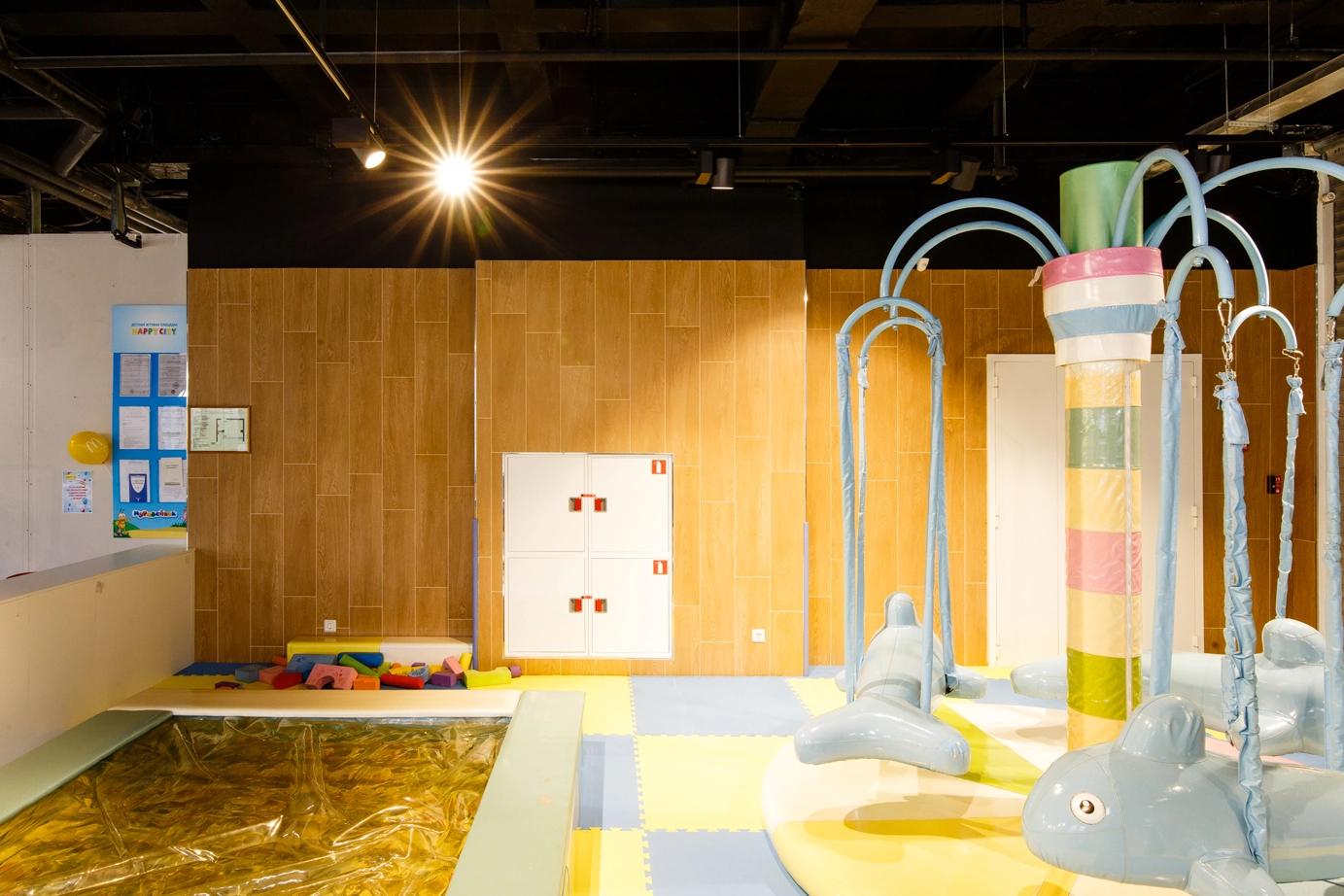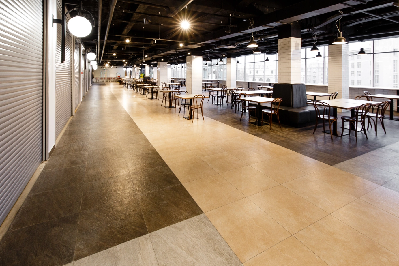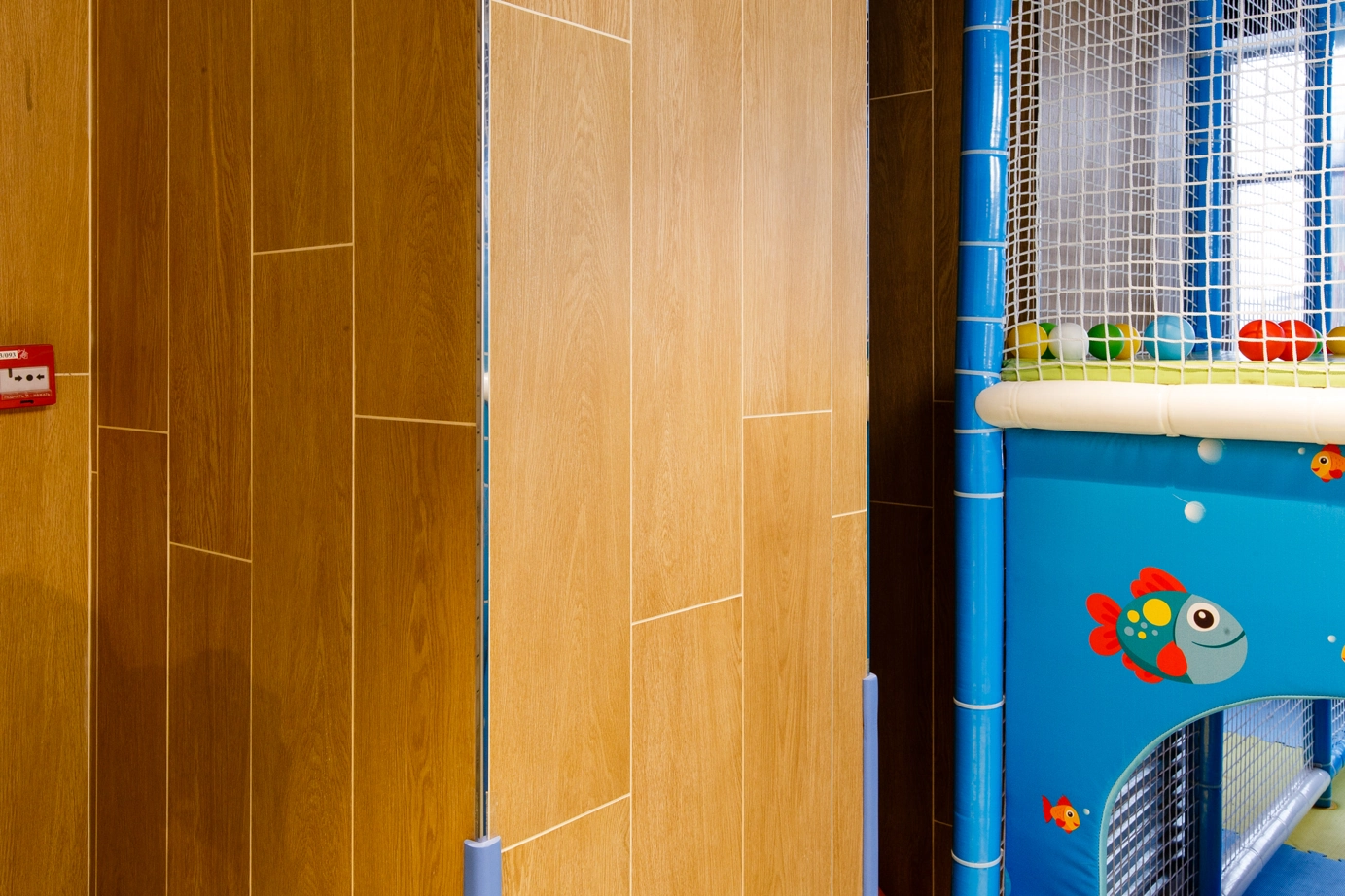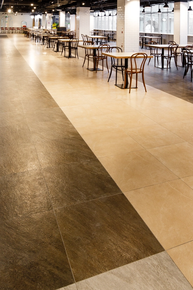На третьем  этаже универмага расположен фуд-корт и детская игровая зона, поэтому его оформили очень уютно и безопасно, сочетая в отделке дерево и камень из коллекций керамогранита Essence, Climb и Materia.