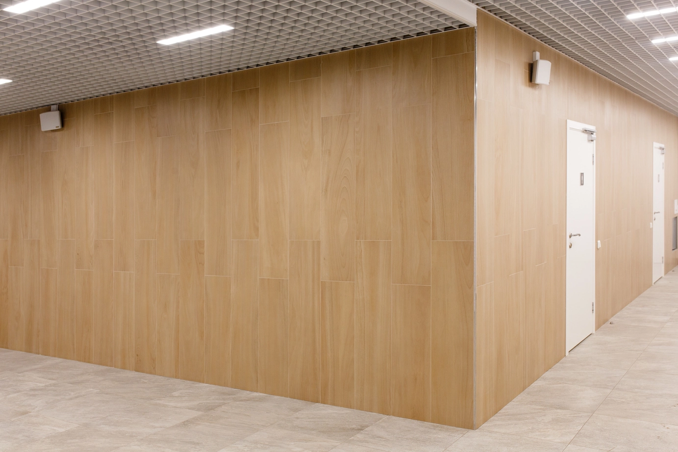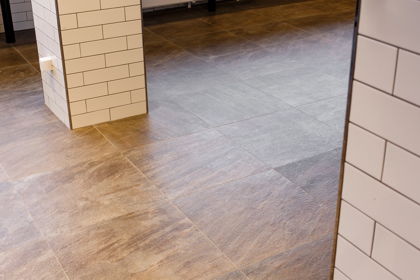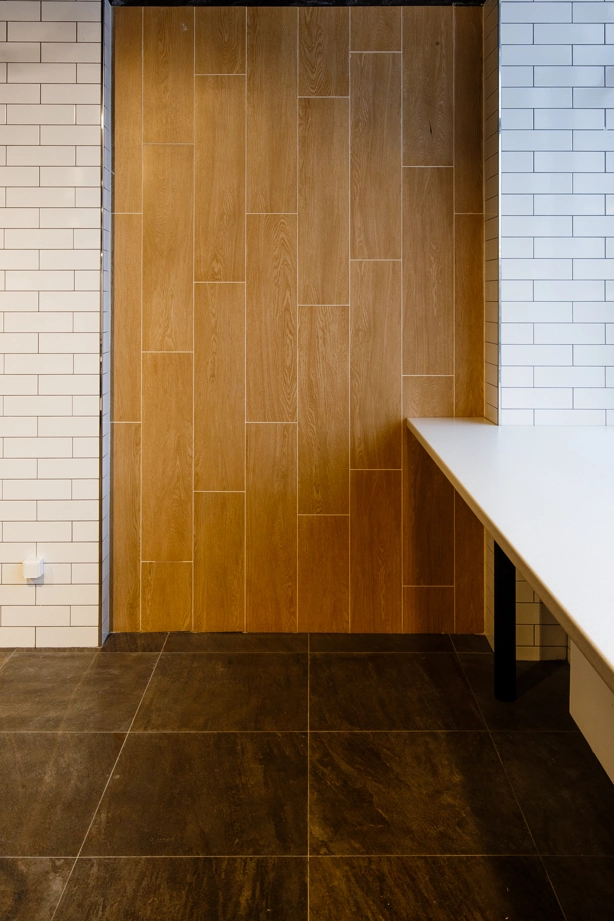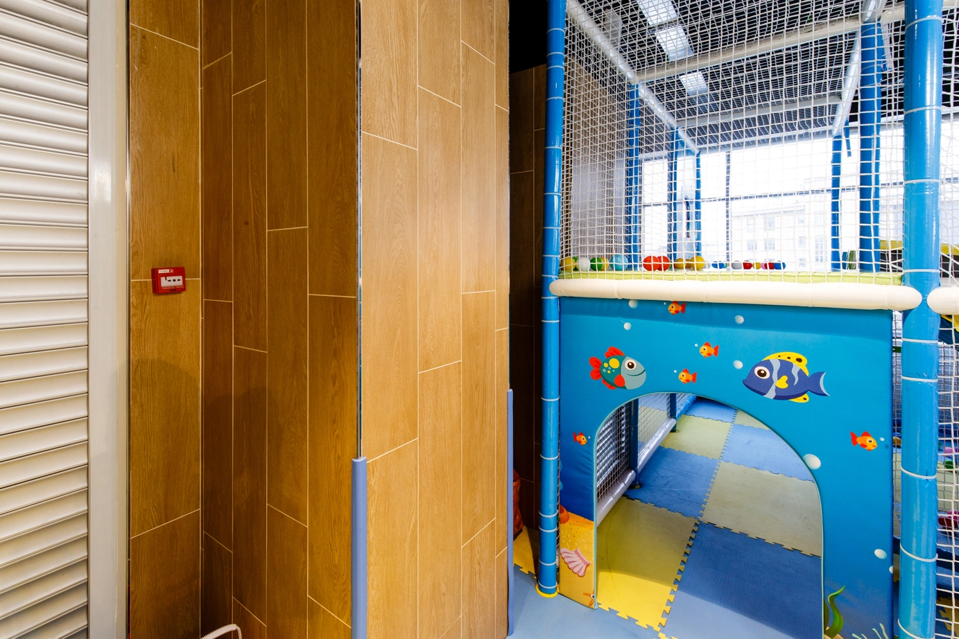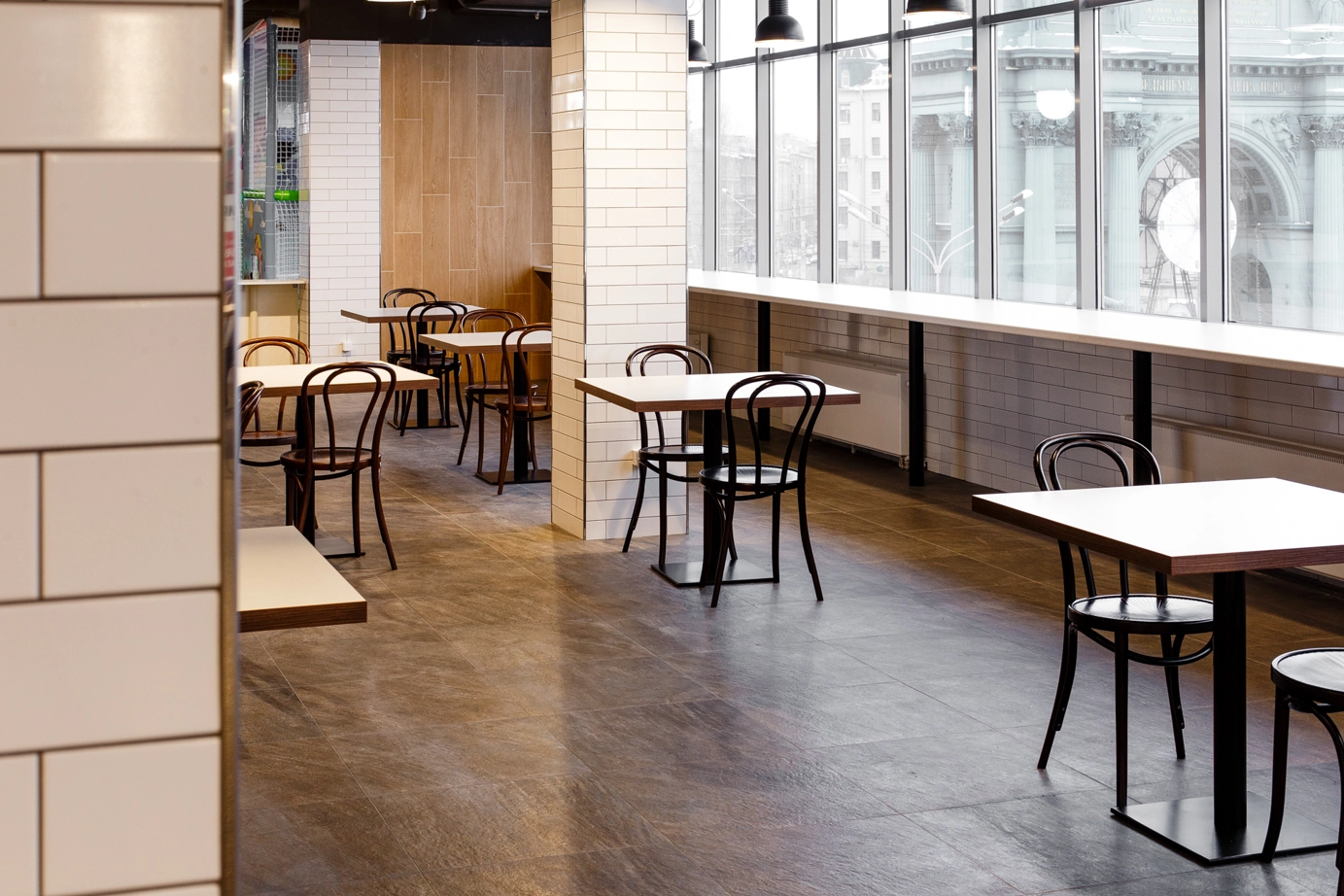 На третьем  этаже универмага расположен фуд-корт и детская игровая зона, поэтому его оформили очень уютно и безопасно, сочетая в отделке дерево и камень из коллекций керамогранита Essence, Climb и Materia.