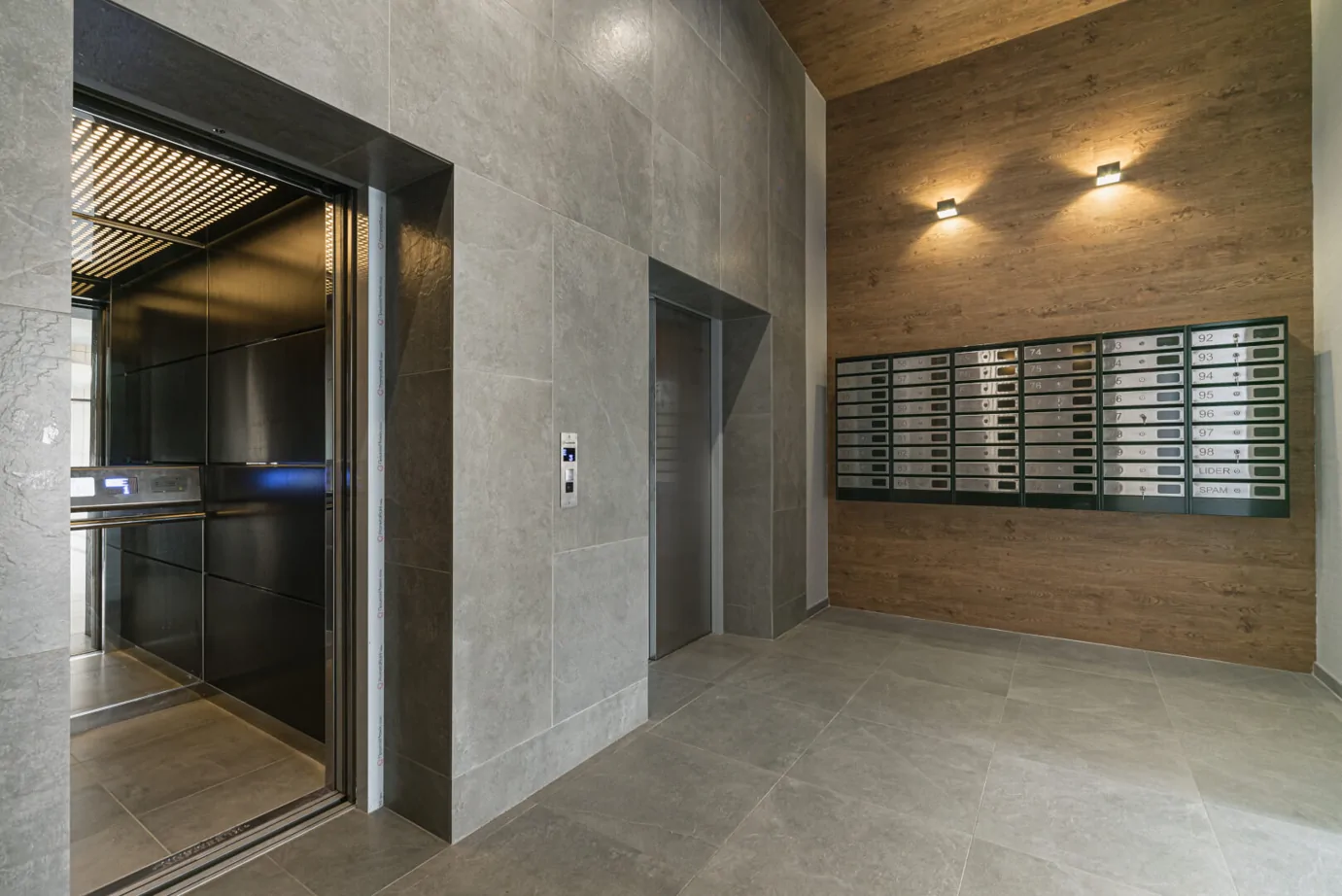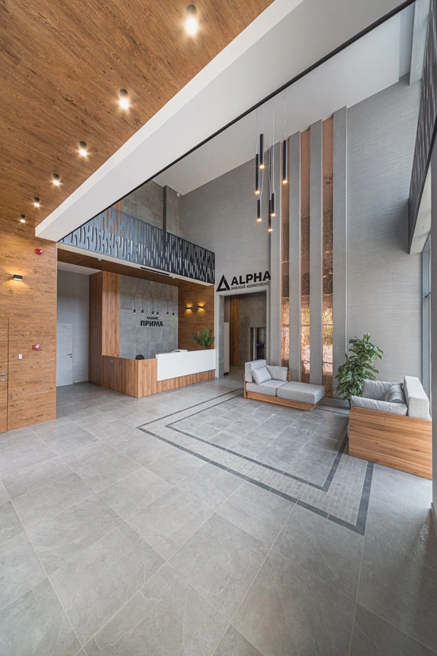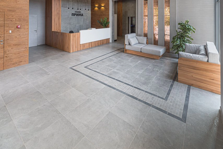 Для Примы это три прямые, выполненные зеркальной мозаикой. Идеальным фоном стал керамогранит Materia Carbonio. Наличие в коллекции разных форматов позволило выделить диванную зону, декорировать стены за стойкой ресепшн и возле дверей лифта. А крупный формат 60Х120 см как нельзя лучше подчеркнул масштабность помещения.