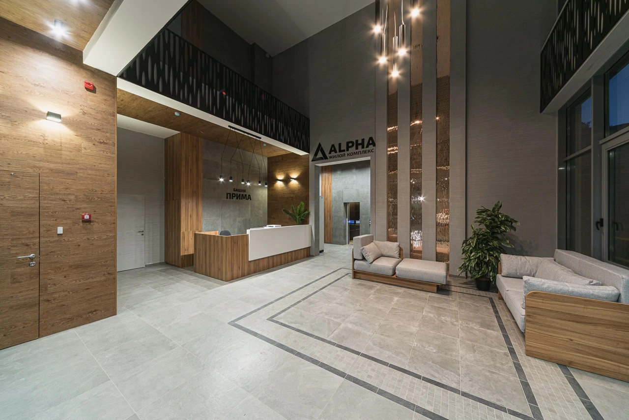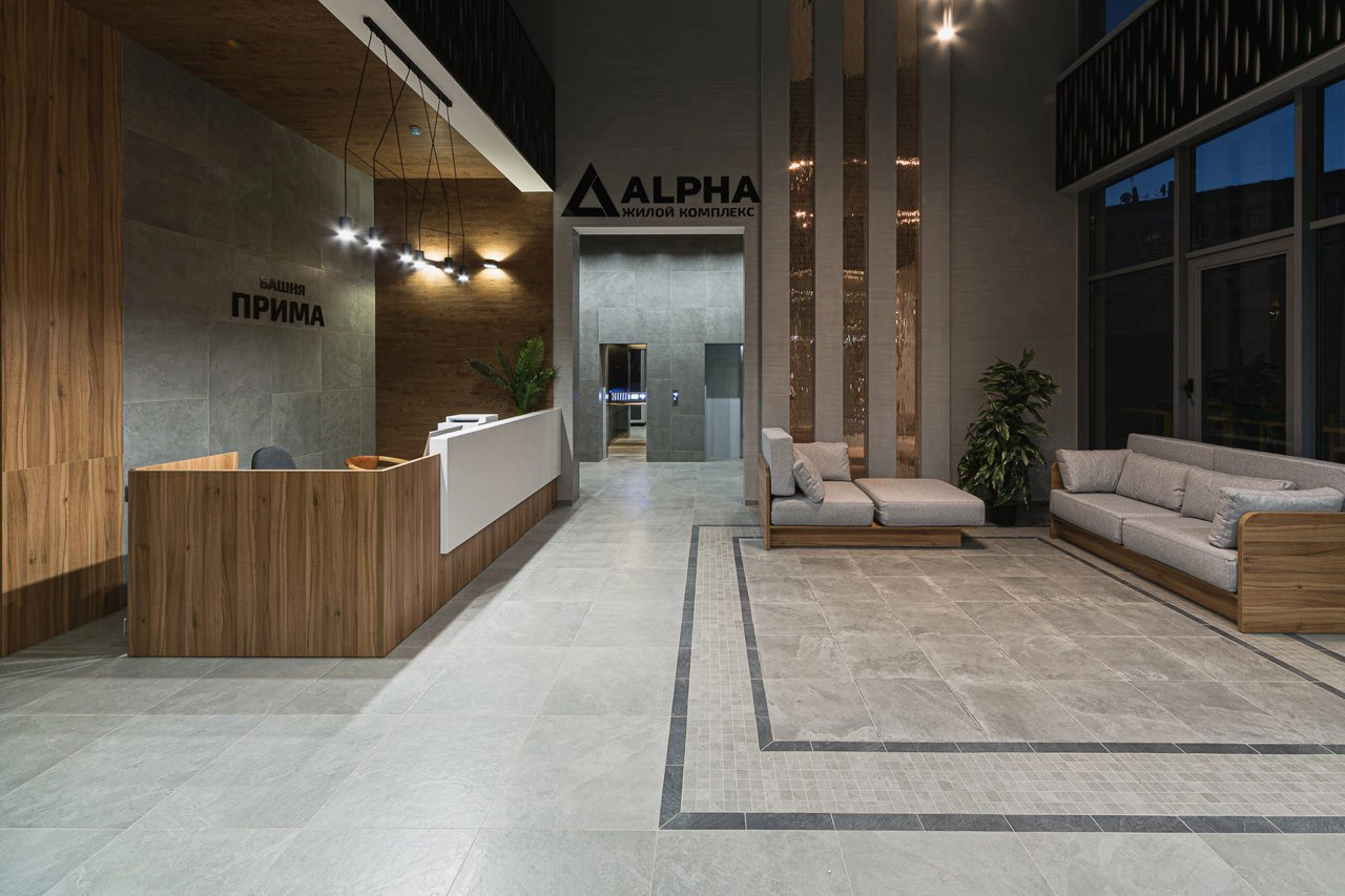 Для всех пяти башен комплекса ALPHA был разработан концепт, который предполагает использование общих решений в отделке, при этом для каждой предусмотрен свой, выделяющий среди остальных, элемент.