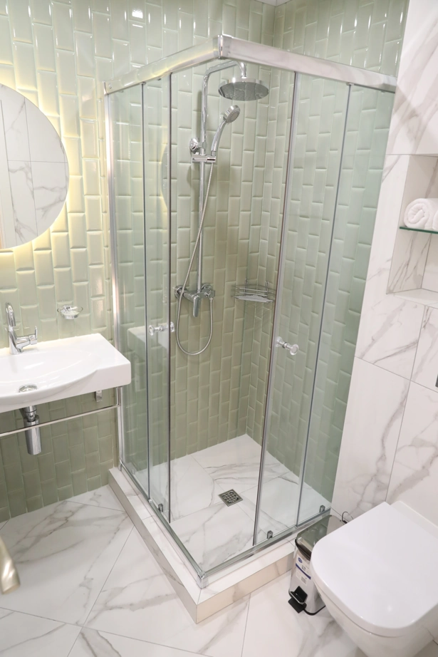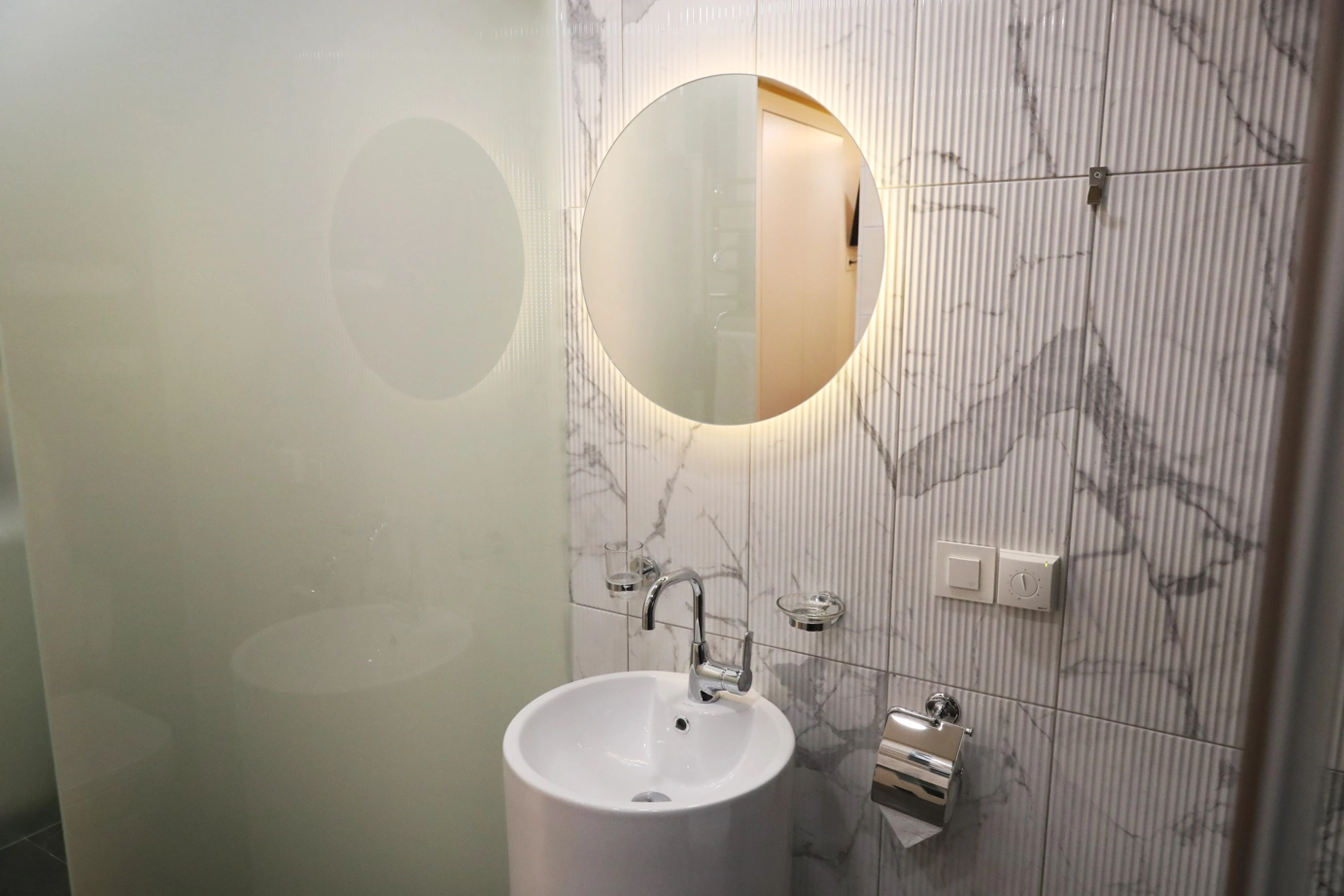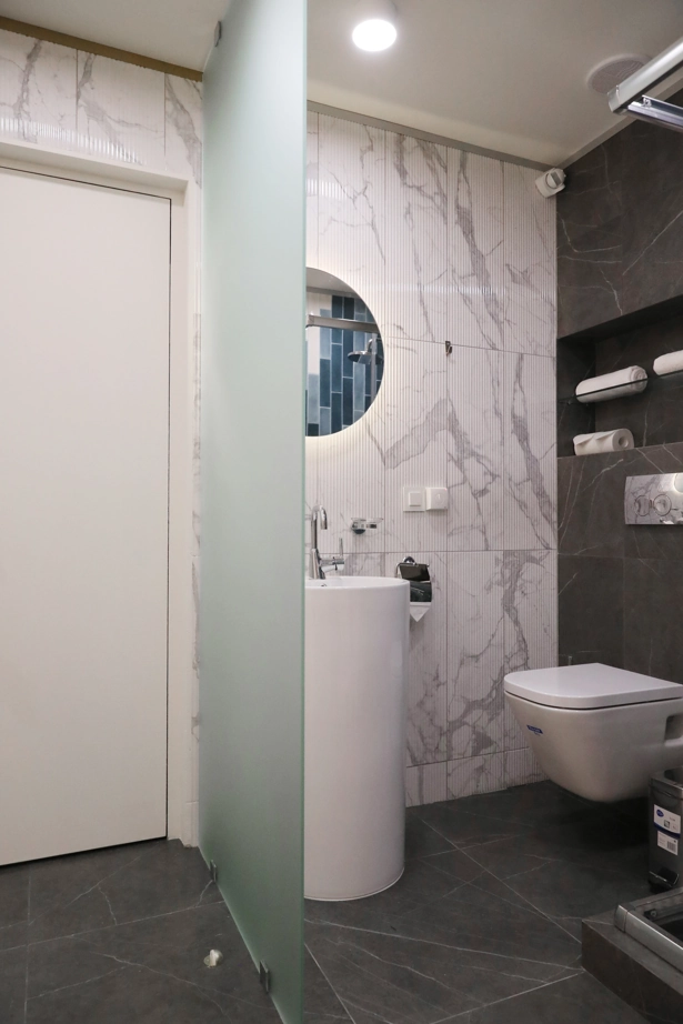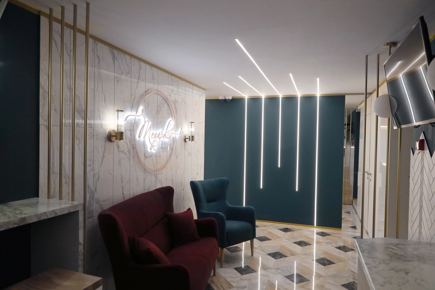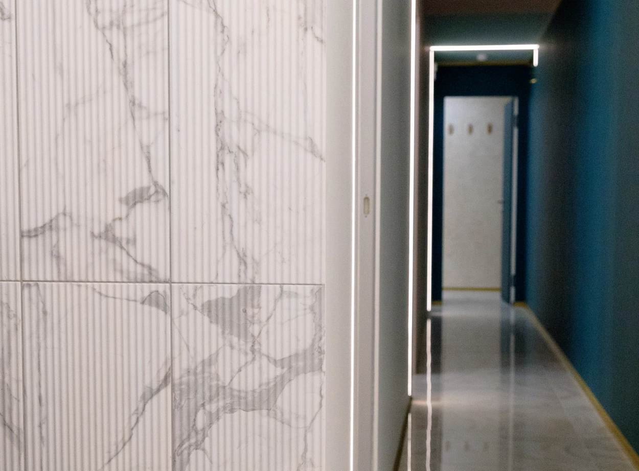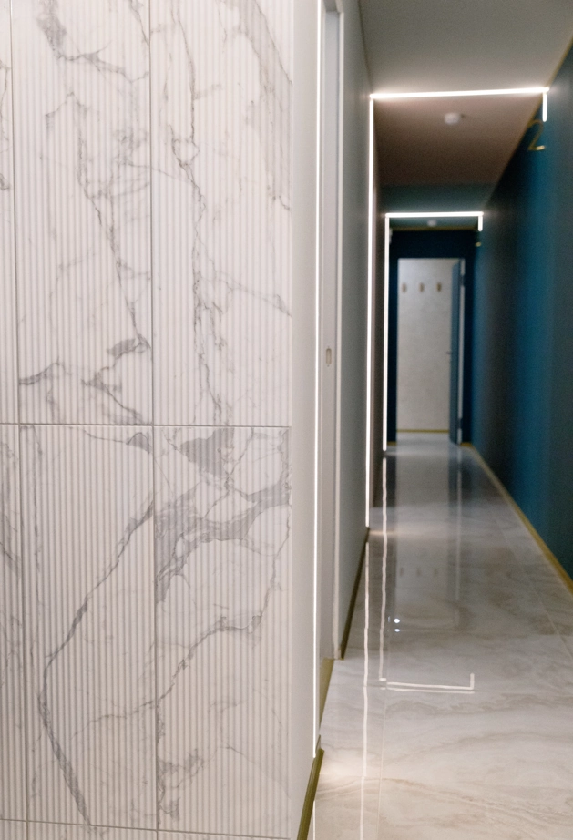 Интерьер отеля получился очень уютным и современным. Для оформления зоны ресепшн и санузлов выбрали плитку из коллекции Charme Evо. Объемные декоры Statuario Inserto Wave 25x75 делают интерьер динамичным под стать ритму мегаполиса, а благородная фактура мрамора отдает почтение историческому прошлому здания, в котором расположен отель.