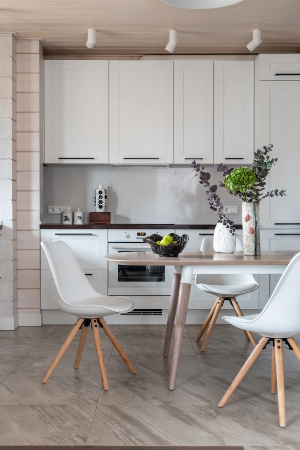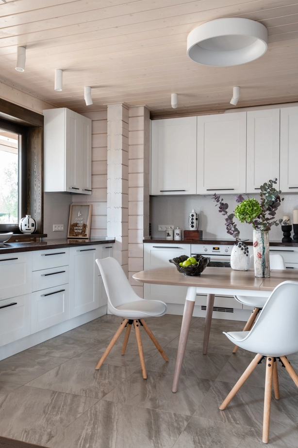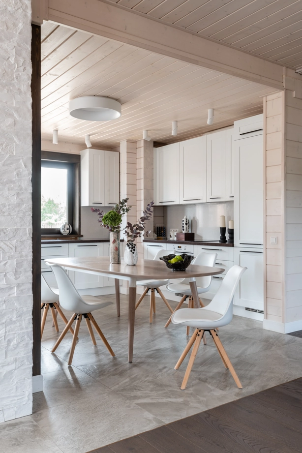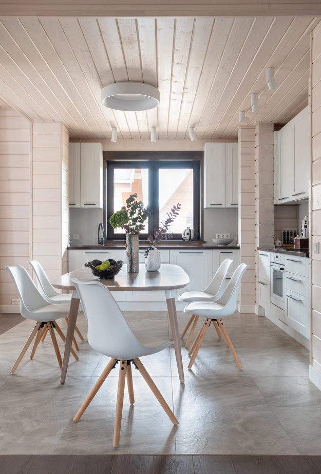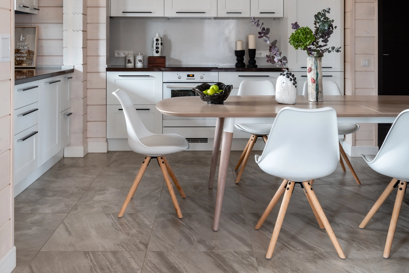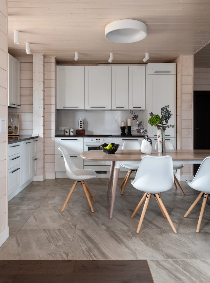 Большую часть первого этажа занимает единое пространство гостиной и кухни-столовой. В качестве напольного покрытия для оформления общей зоны использовали светлый керамогранит под камень Magnetique Mineral White 60×60 в натуральной поверхности.
