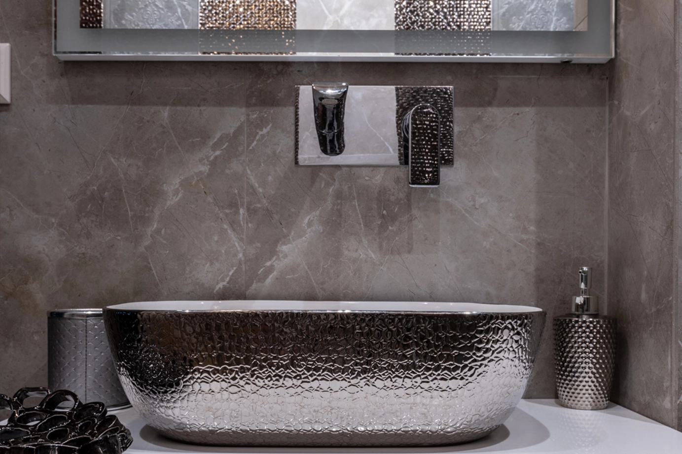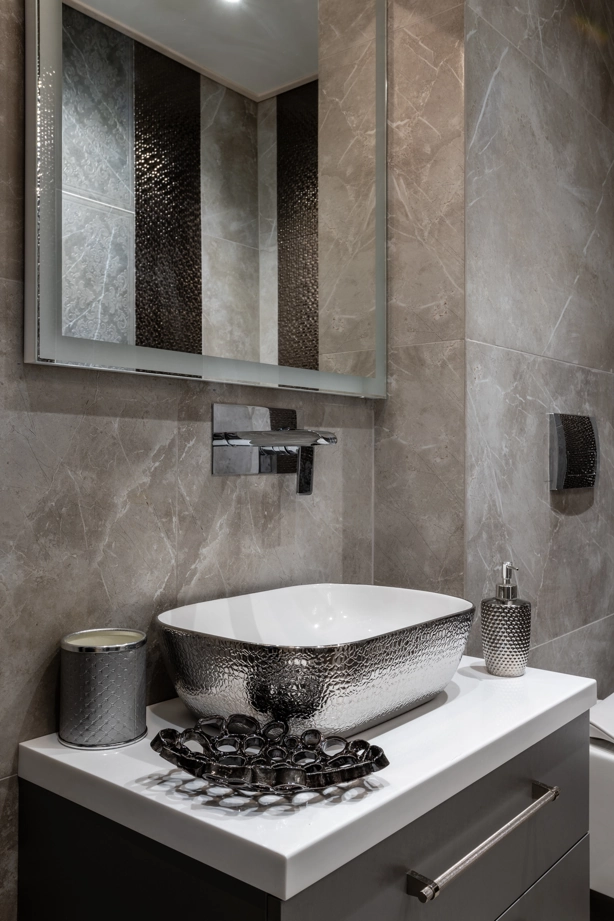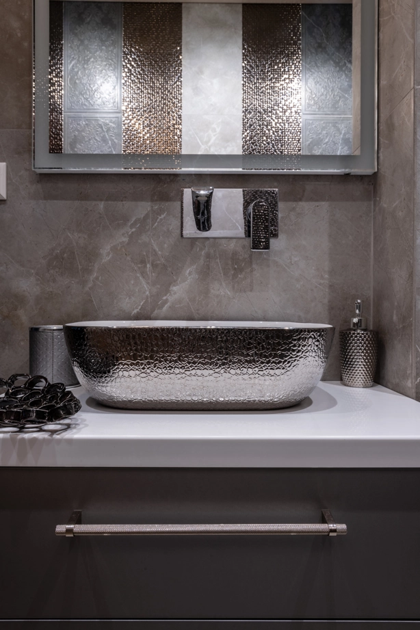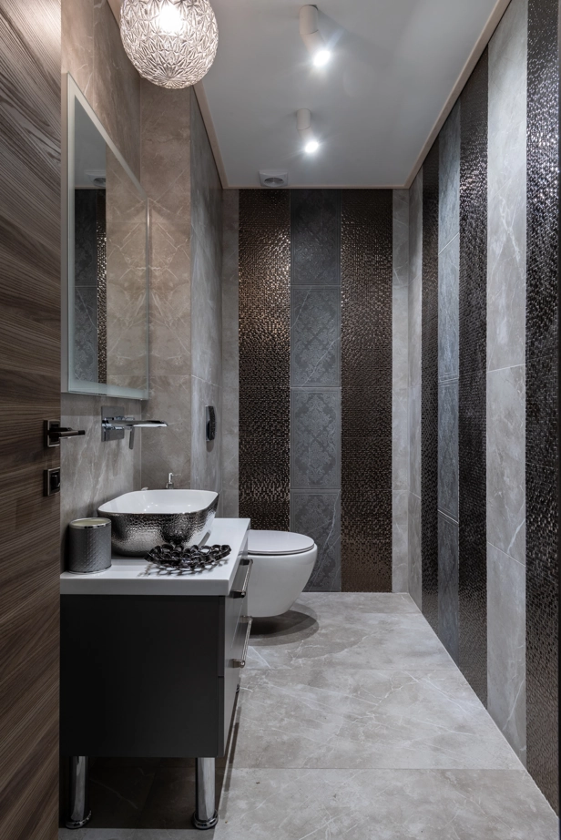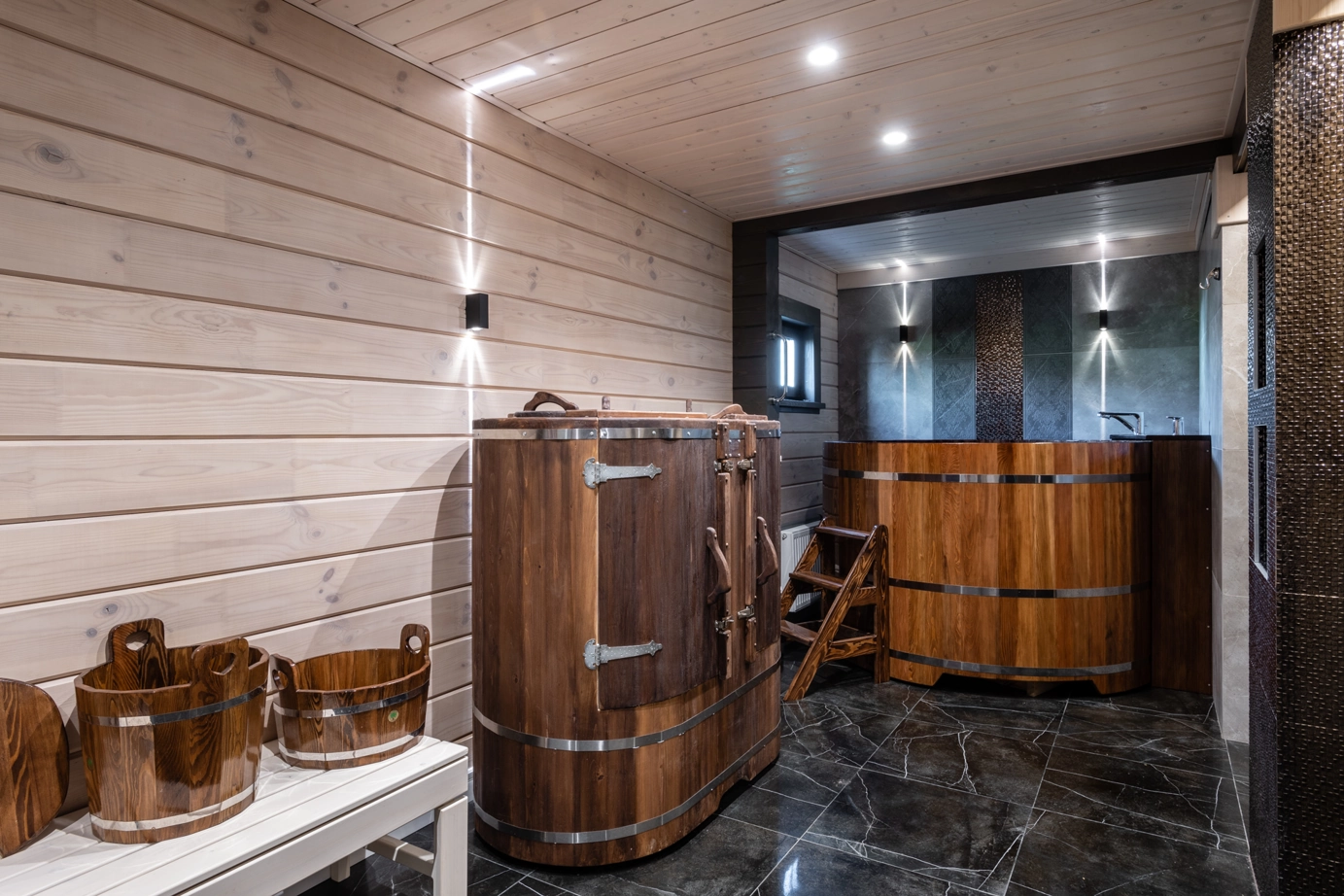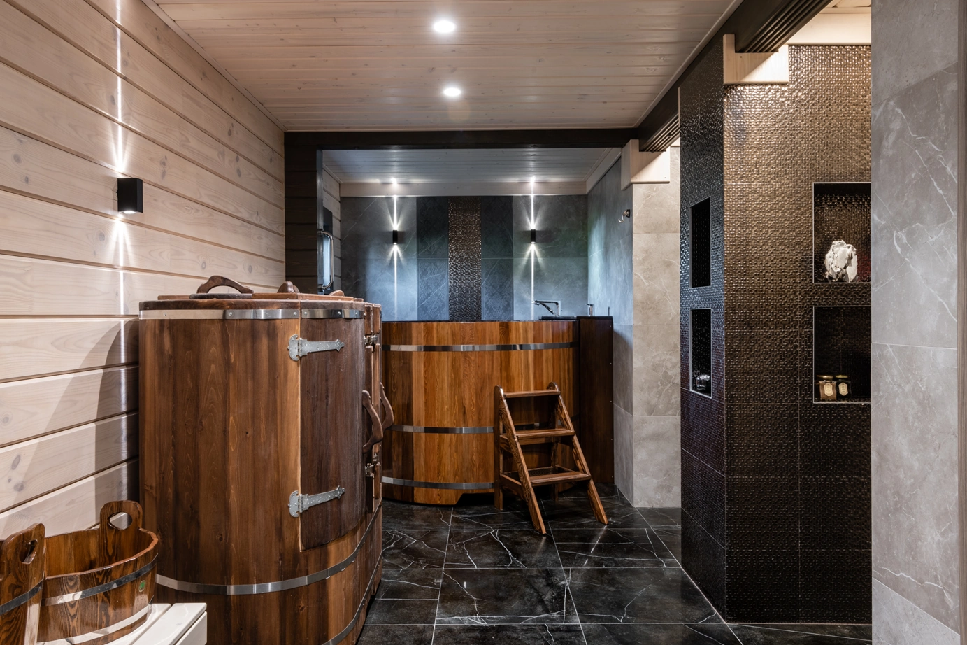 Если дом получился спокойным и светлым, то при оформлении бани было важно создать выразительный интерьер, который будет интересно изучать и рассматривать. Сам банный комплекс включает душевую, сауну, кедровую фито-бочку и купель. Настроение в нем создает декор Inserto Broccato Antracite 30×60 в патинированной поверхности из коллекции Charme Evo с восточным орнаментом и мозаика Materia Gold 30×30 с металлическим эффектом. Основная часть стен облицована светло-серой плиткой под мрамор Charme Evo Imperiale в форматах 30×60 cerato и 60х120 nat, а пол такой же темный и контрастный, как и в основных помещениях. На фоне открытого бруса данная отделка выглядит эффектно, в духе эклектичных американских интерьеров. Сформированное пространство располагает к приятному отдыху от московской суеты как в узком семейном кругу, так и в компании друзей.