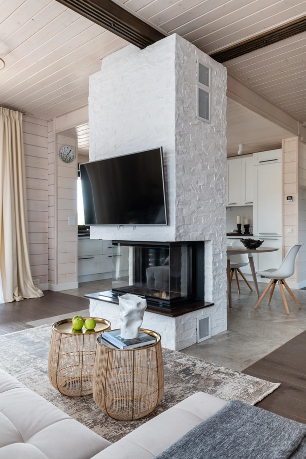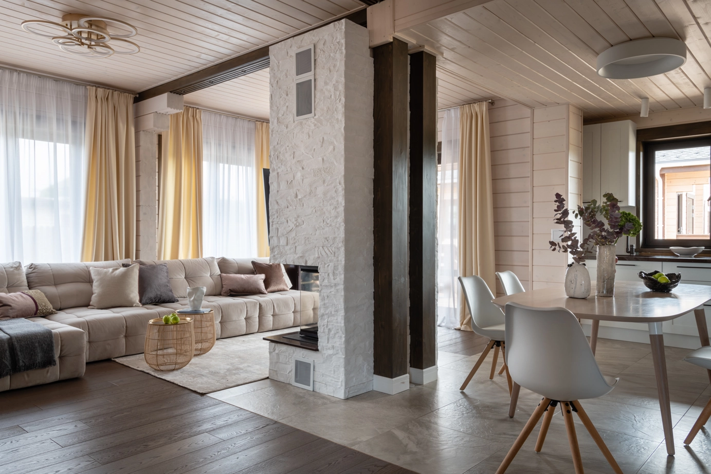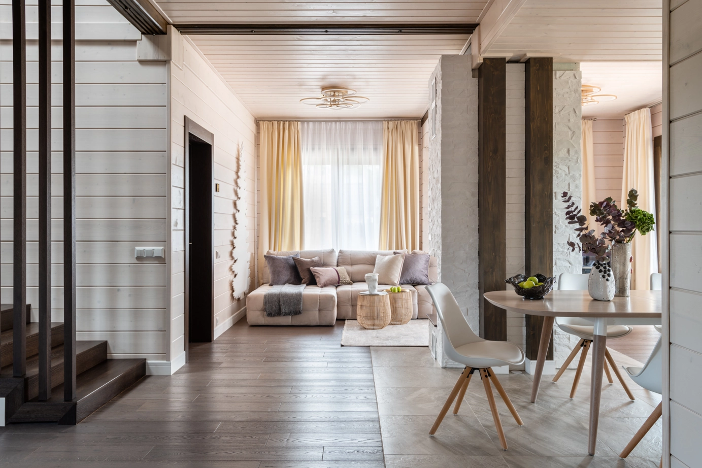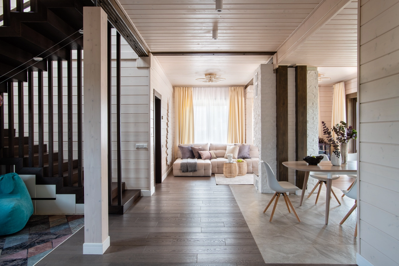 Для оформления дома была выбрана светлая цветовая гамма с преобладанием натуральных оттенков, чтобы помещения выглядели еще больше и просторнее.