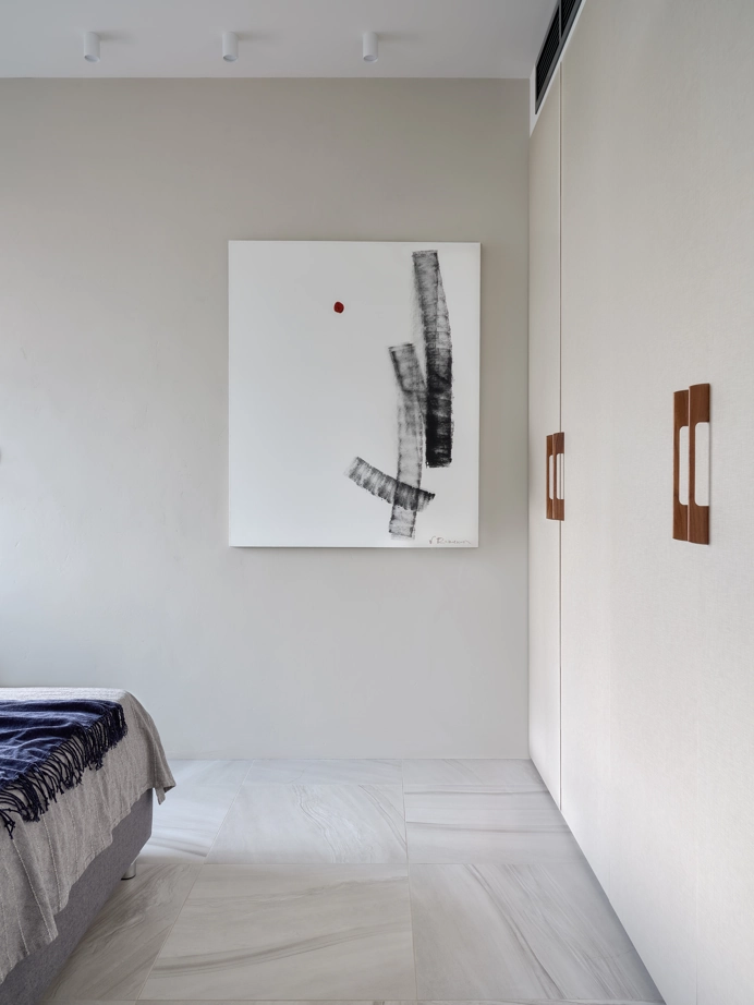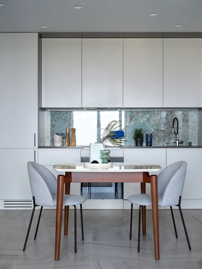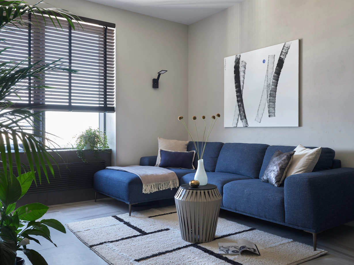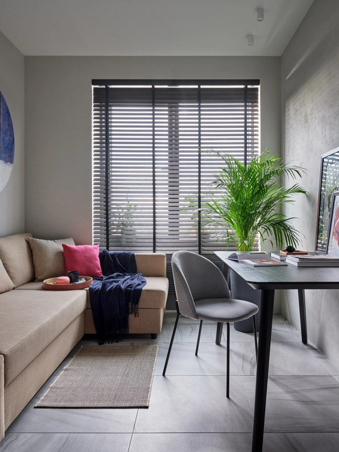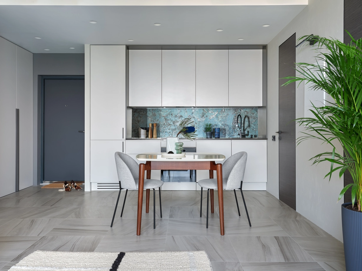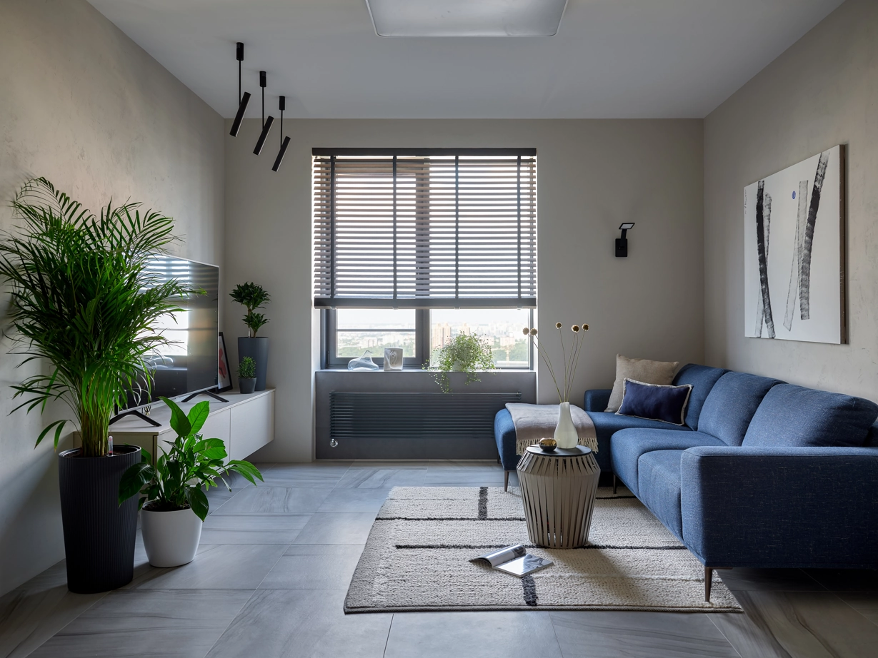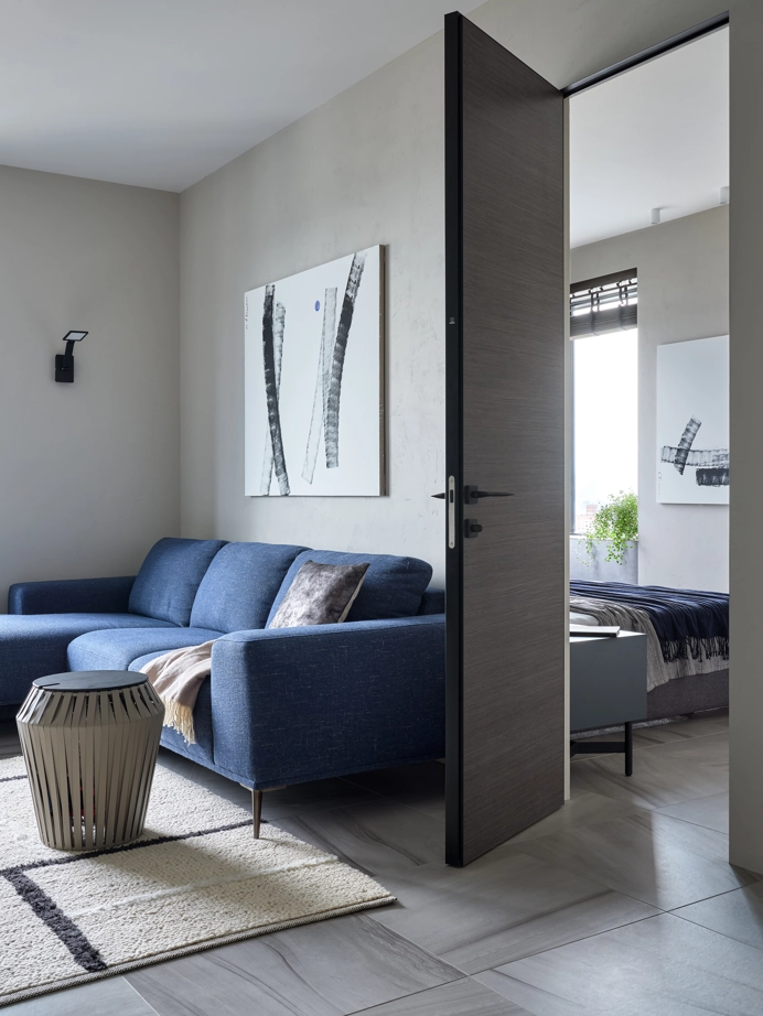 Абсолютно во всех комнатах сделали единый пол с помощью керамогранита под мрамор Wonder Graphite 60×60 с натуральной поверхностью. Затем добавили крупные яркие акценты: в гостиной это мягкий синий диван, в спальне – льняные ткани в синих тонах, в а кабинете – эффектная картина с ярким синим цветом.