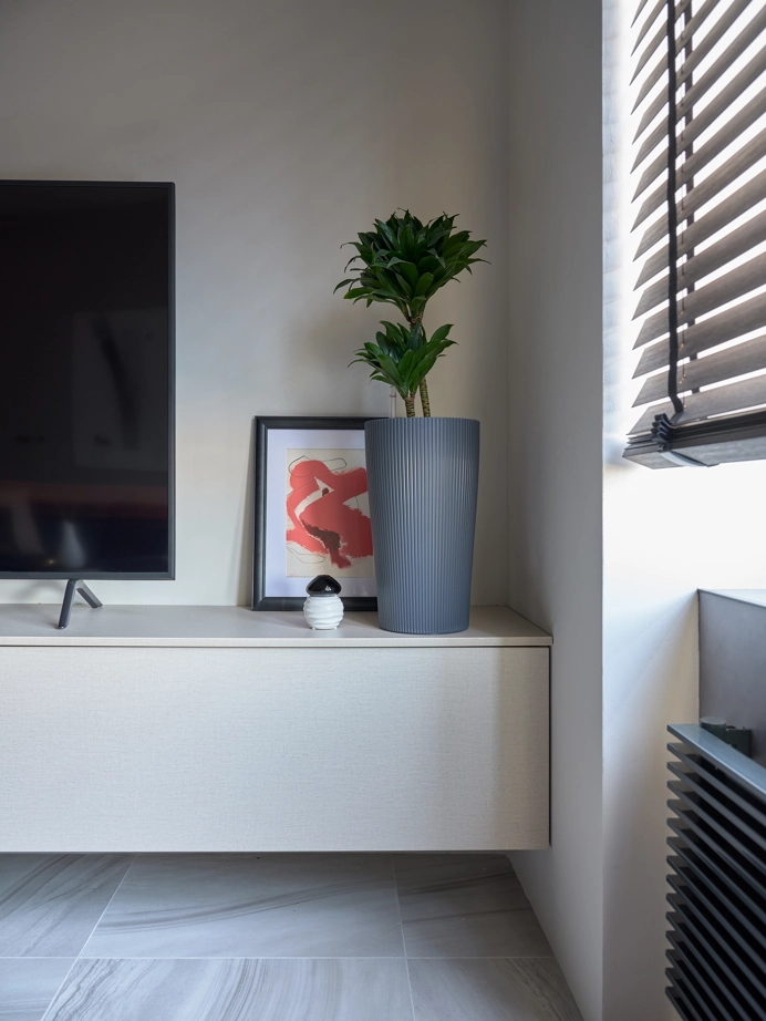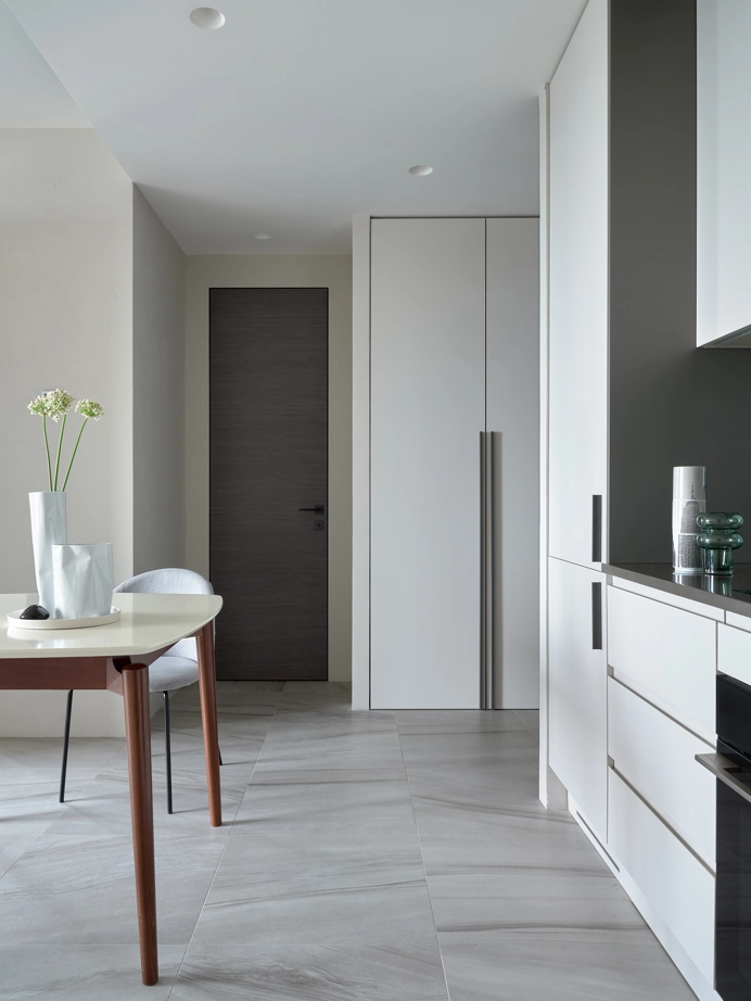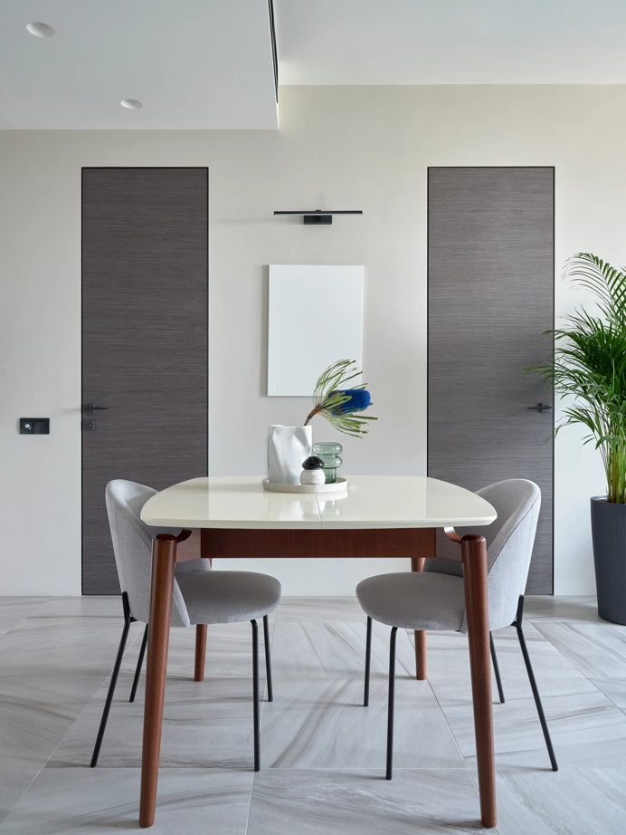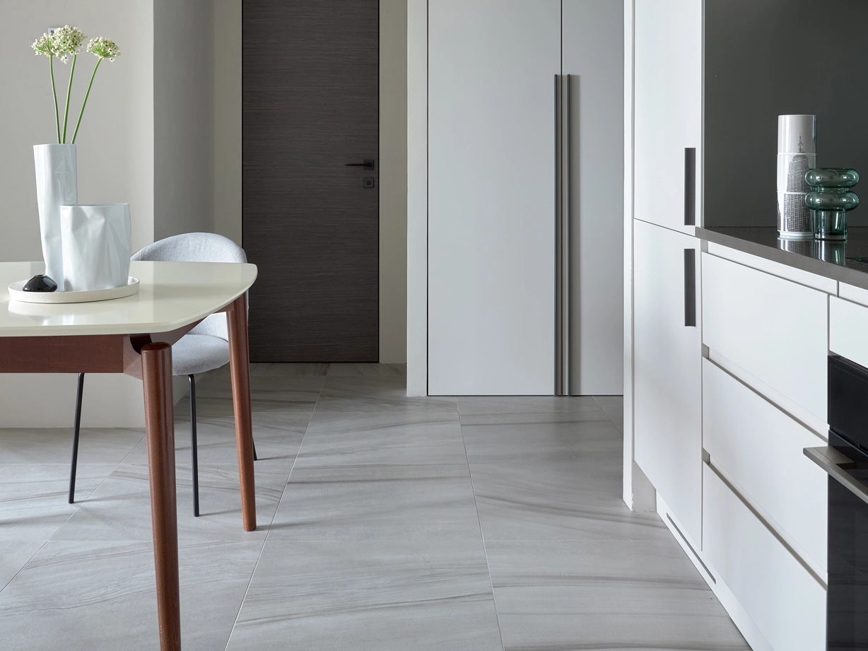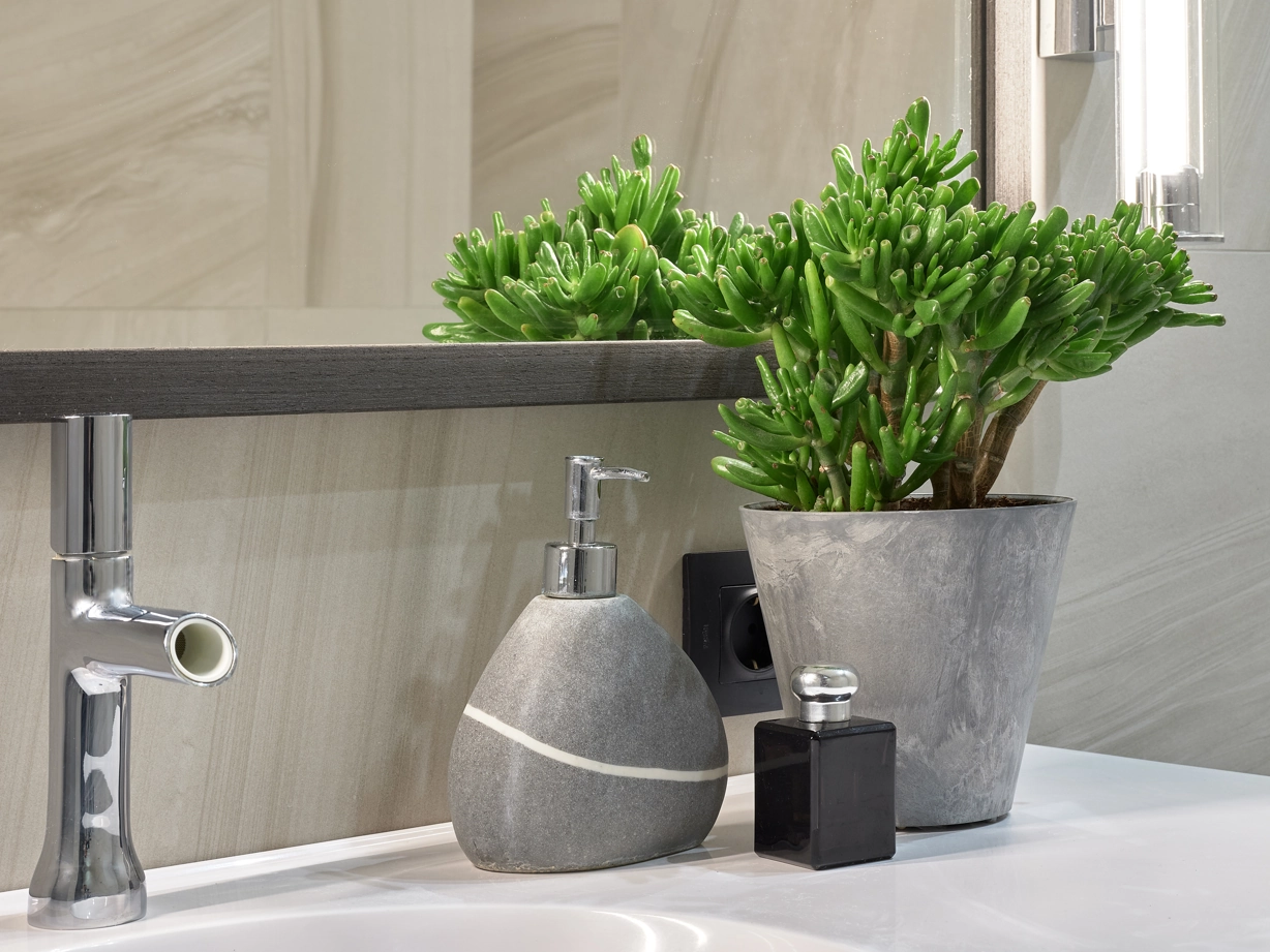 Стены в ванной выложены также плиткой из коллекции Wonder в цвете Moon и Moka 60х60 с натуральной поверхностью, на полу – Graphite 60х60, как и во всей квартире. Удобная тумба с раковиной вмещает все необходимое для ежедневного использования. Смесители оригинальной формы напоминают стебли бамбука.