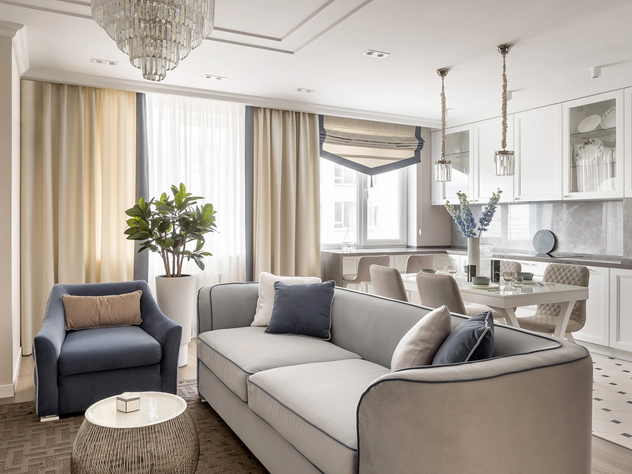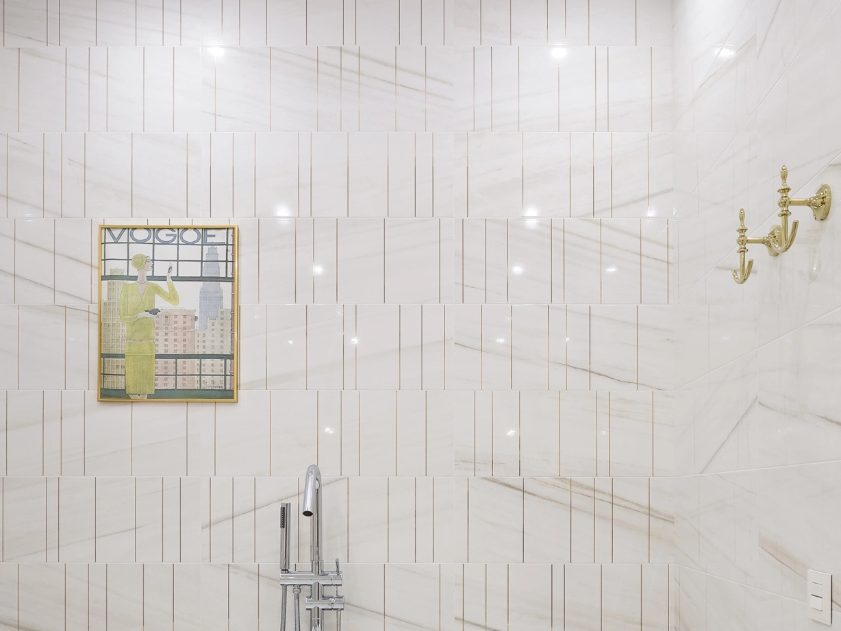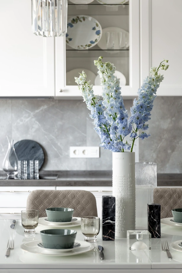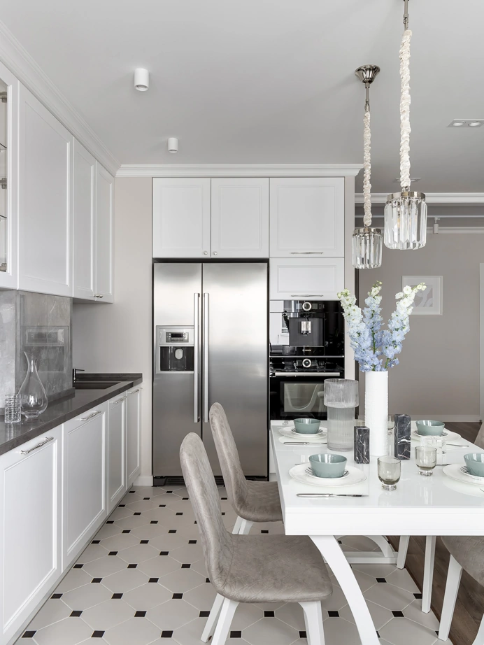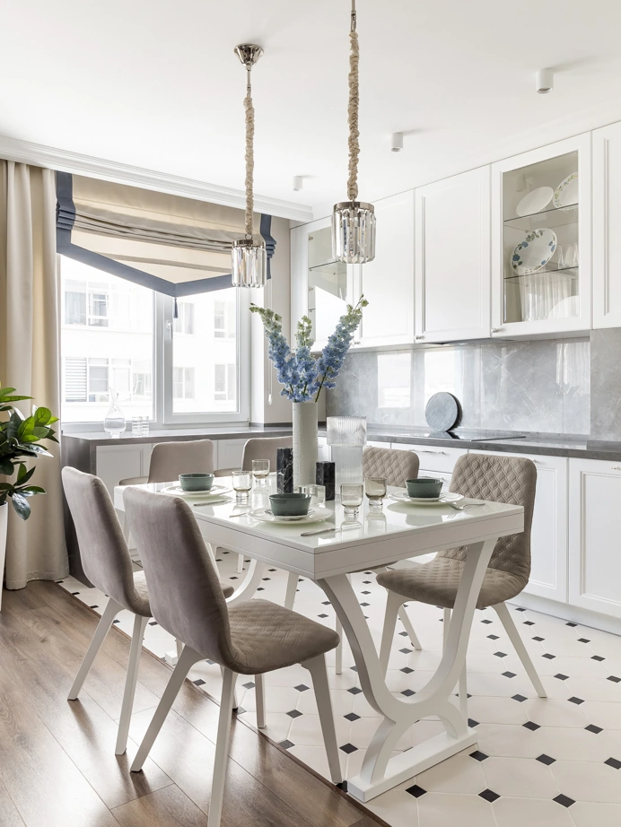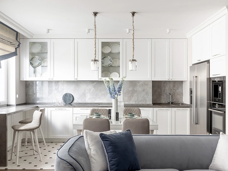 В роскошной кухне-гостиной притягивает взгляд кухонный фартук, облицованный керамогранитом Charme Evo Imperiale 60×60 с глянцевой поверхностью lux. Стильный светло-серый оттенок мрамора гармонично перекликается с другими элементами интерьера.