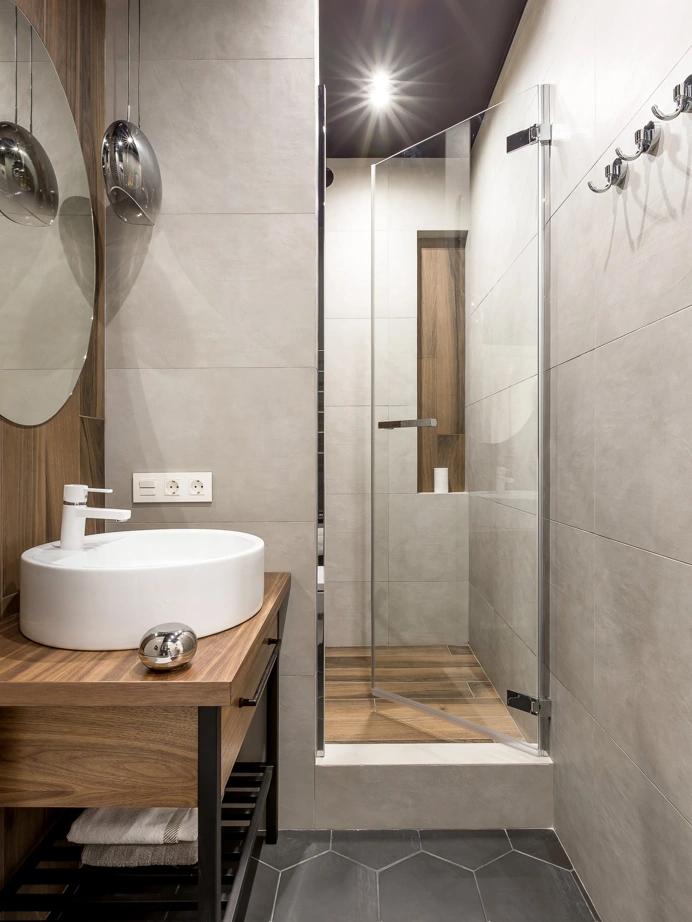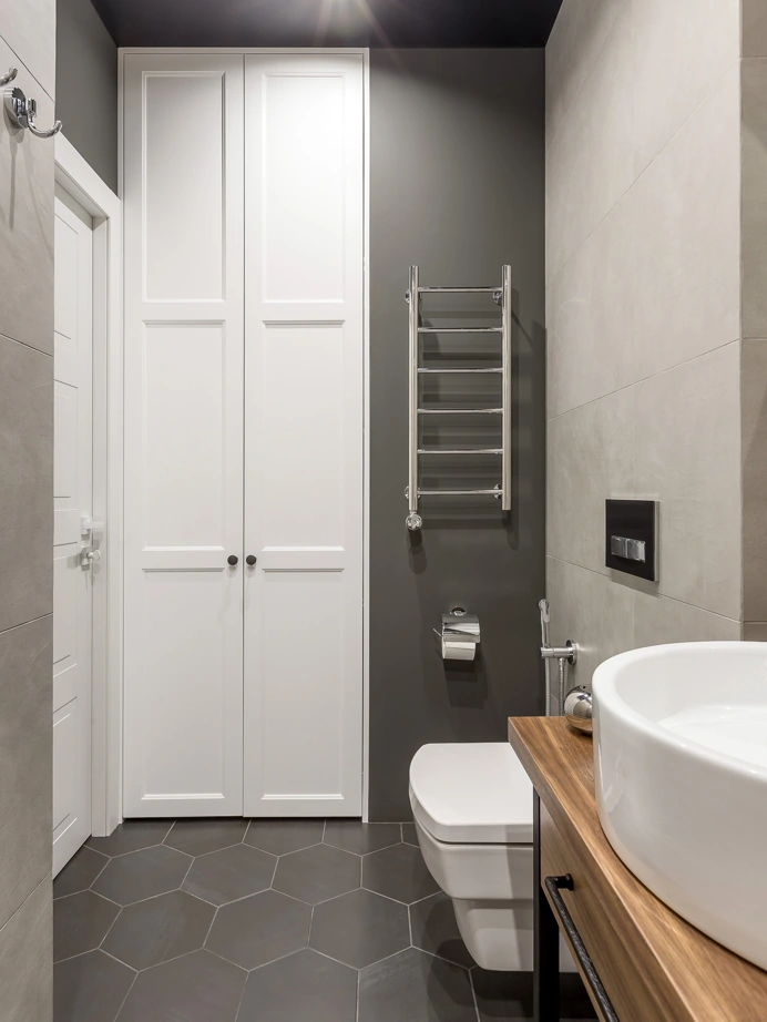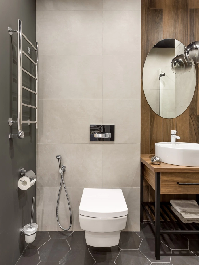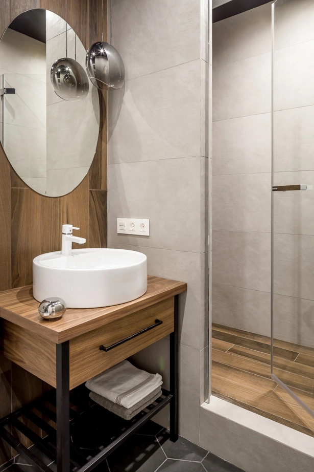 В квартире два санузла, выполненных в совершенно разных стилях. Один с мужским характером, для его отделки использовали сочетание плитки под бетон из коллекции Urban и теплого керамогранита под дерево из серии Maison Walnut 15х120.